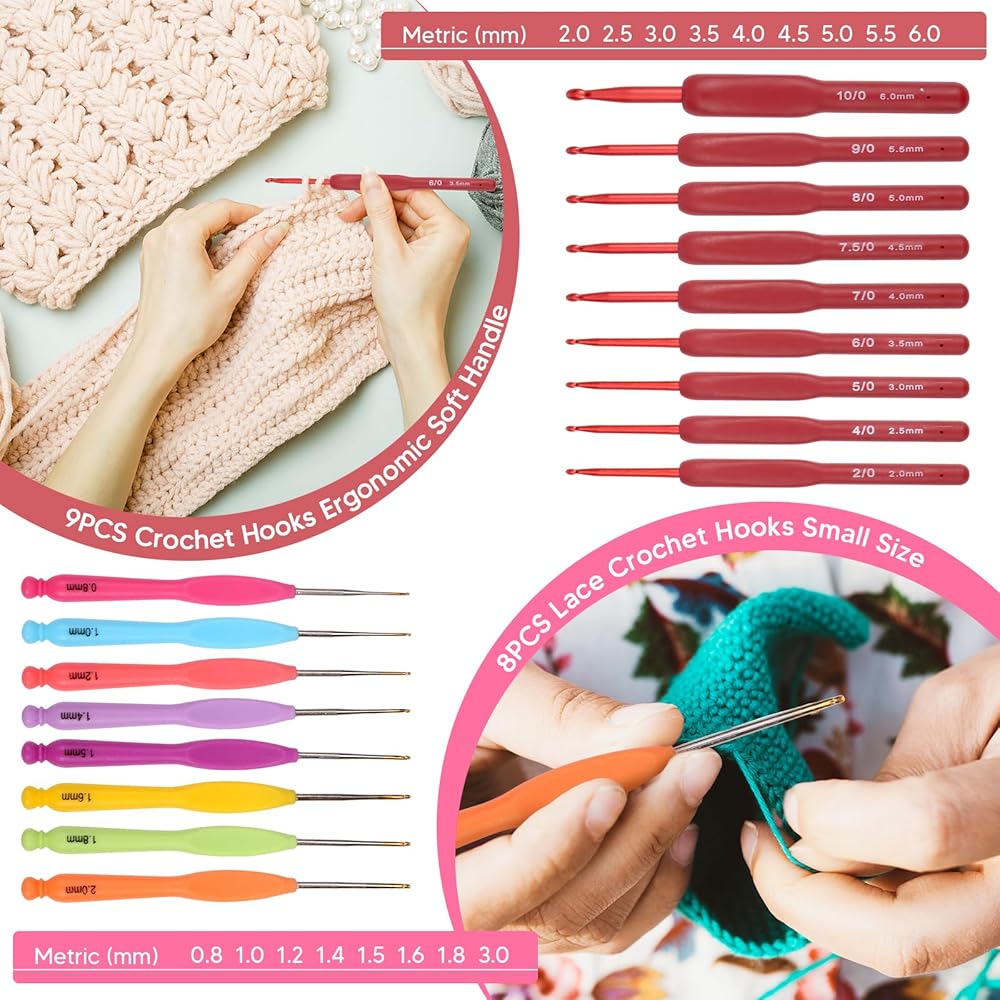 Durable & Comfortable Crochet Hook ------ The red rubber handled crochet hook is ergonomically designed and comes in 9 sizes with a size code. The smooth crochet hook glides smoothly over the yarn and is very comfortable to use and hold. Lace crochet hooks are available in 8 different sizes for knitting delicate small lace.