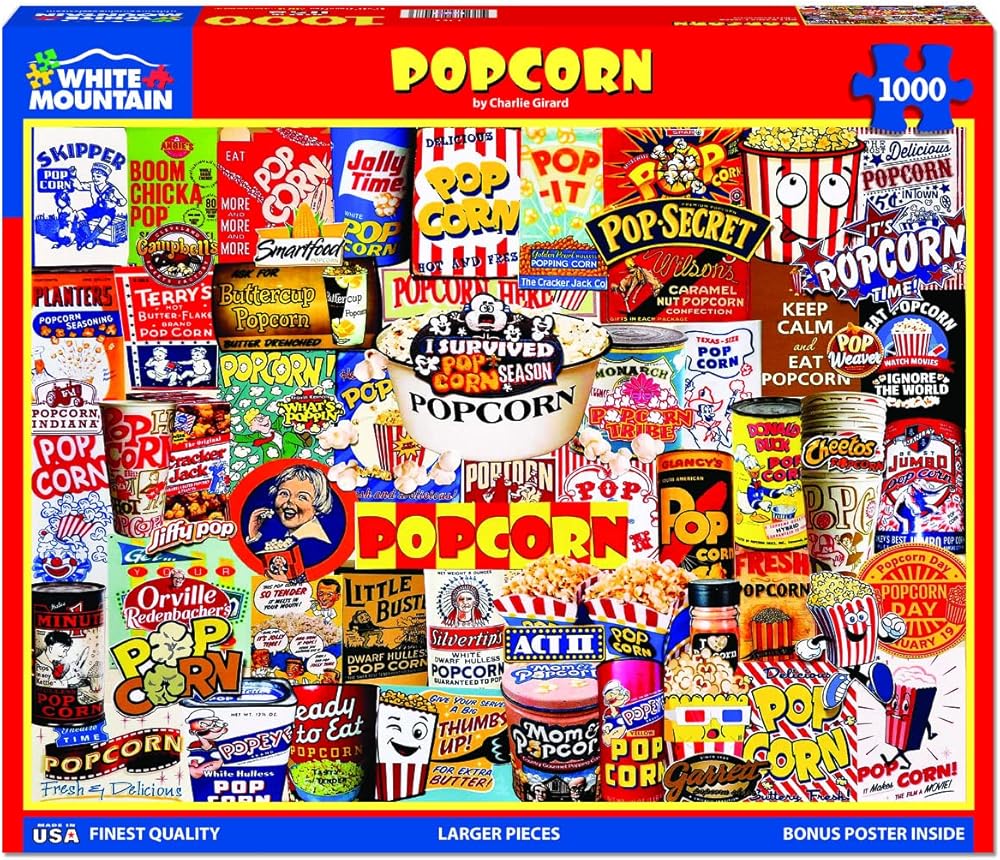 1755 Popcorn. How much do you like popcorn? Brands from the past and present are represented in this 1000 piece jigsaw puzzle created and designed by artist Charlie Girard. Finished size 24" x 30". Every White Mountain Puzzle includes our HAPPINESS GUARANTEE: If you are not completely delighted with your puzzle experience, we will replace your puzzle with a new one for free.