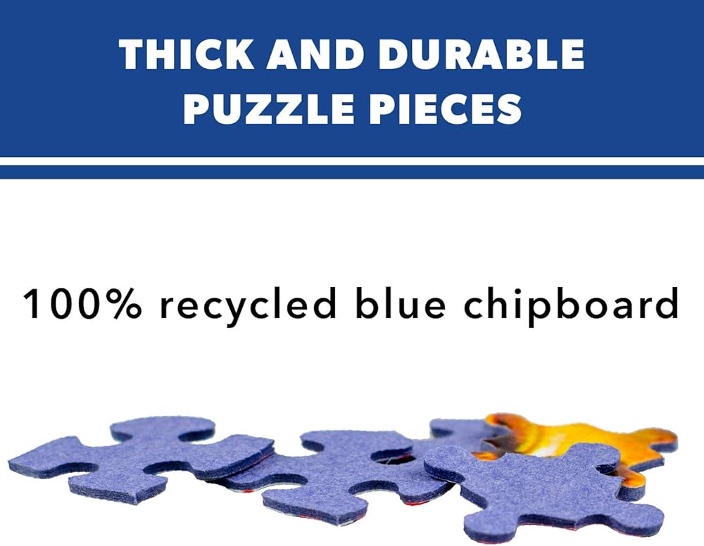 HIGH QUALITY DESIGN: This 1000 piece jigsaw puzzle contains thick interlocking pieces made from recycled premium blue chipboard that give a sturdy feel & easy grip. Made in USA. Finished size 24”x30”.