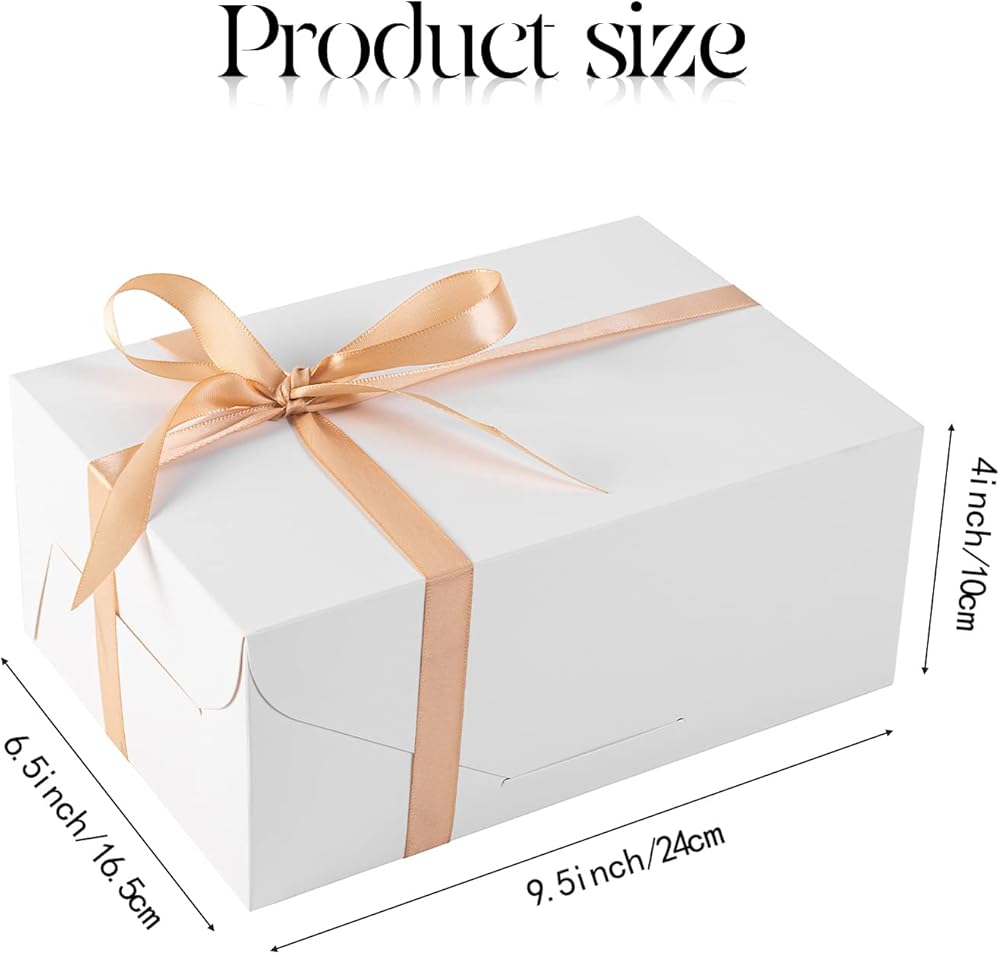 • تتضمن عبوة صناديق الهدايا 12 صندوق هدايا أبيض مع أشرطة، 9.5 × 6.5 × 4 انش/ 24 × 16.5 × 10 سم. صناديق الهدايا الصغيرة هذه بحجم وشكل لهدايا الحفلات، وصندوق وصيفة العروس، وصناديق هدايا لهدايا الكريسماس