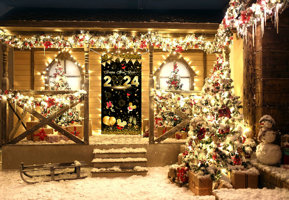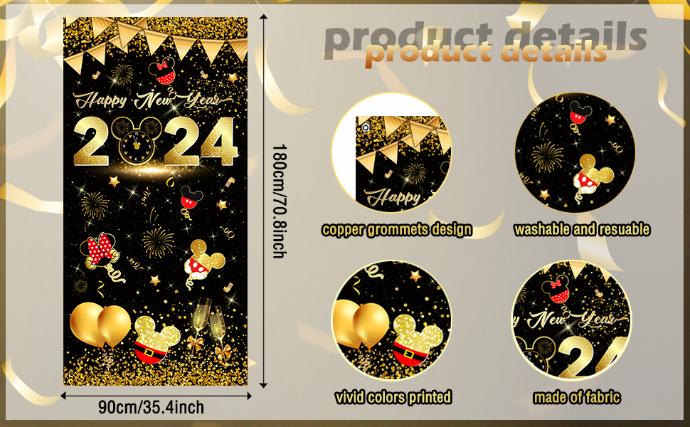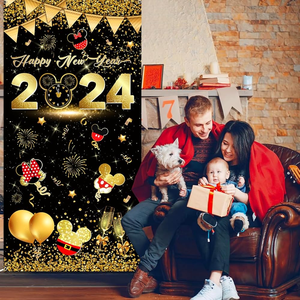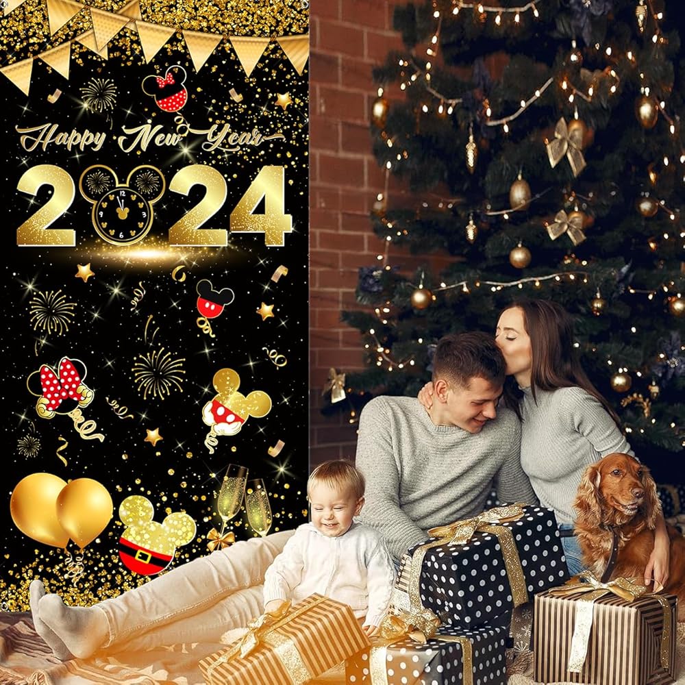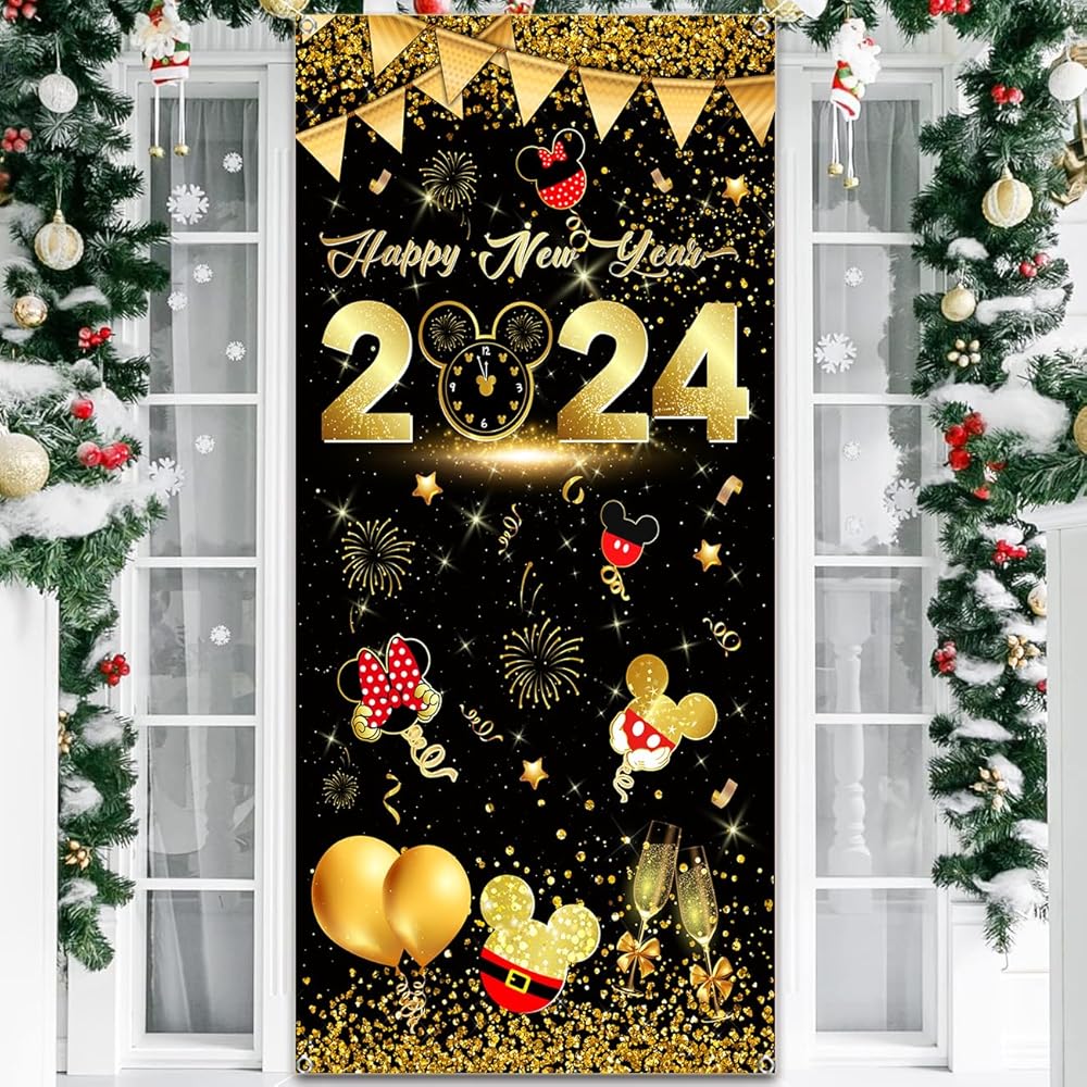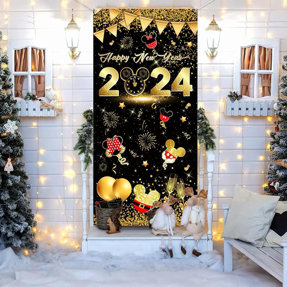 Perfect New Years 2024 Decoration:This New years 2024 decorations door cover features unique mouse designs and large letters "happy new years 2024", decorated with new years elements such as gold stars, firework,balloon and more. This New Years door decoration is highly visible and attracts attention, it can also be used as a photo booth prop.