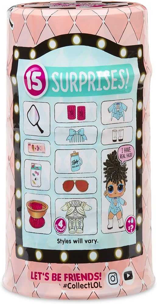 حان وقت الكشف الكبير، لأن ال.او.ال. مفاجأة! احصلي على مظهر رائع للشعر الحقيقي أو الشعر اللامع! من المفاجآت الجديدة إلى المظهر الجديد إلى طرق جديدة تمامًا لفتح العلبة، تدور سلسلة المكياج حول التحول. اجمع جميع الشخصيات الـ 12 واستمتع بأسلوب رائع مع ال.او.ال. مفاجأة! #هير جولز. ال.او.ال مفاجأة! دمى #هير جولز جاهزة للكشف عن مظهرها الجديد، بما في ذلك الشخصيات الجديدة ذات الشعر الحقيقي في العديد من الأنماط الرائعة. افتح 15 مفاجأة! (1) مرآة سحرية؛ (2) رسالة سرية؛ (3) ملصقات مشبك الشعر؛ (4) كرسي صالون؛ (5) أدوات تجعيد الشعر؛ (6) مشط؛ (7) زجاجة؛ (8) إكسسوارات عصرية؛ (9 12) تنكر غامض؛ (13) زي؛ (14) حذاء؛ (15) ال. او. ال. مفاجأة! #دمية هيرجولز. يمكن أن يتحول بخاخ الشعر الجديد إلى كرسي صالون أو حقيبة عرض أو حامل دمية أو محفظة. قم بإطعام الدمية أو تحميمها لاكتشاف مفاجأة مائية، بما في ذلك تغيير اللون! اجمع جميع الشخصيات والمفاجآت الجديدة الرائعة مع ال.او.ال. مفاجأة! #هير جولز.