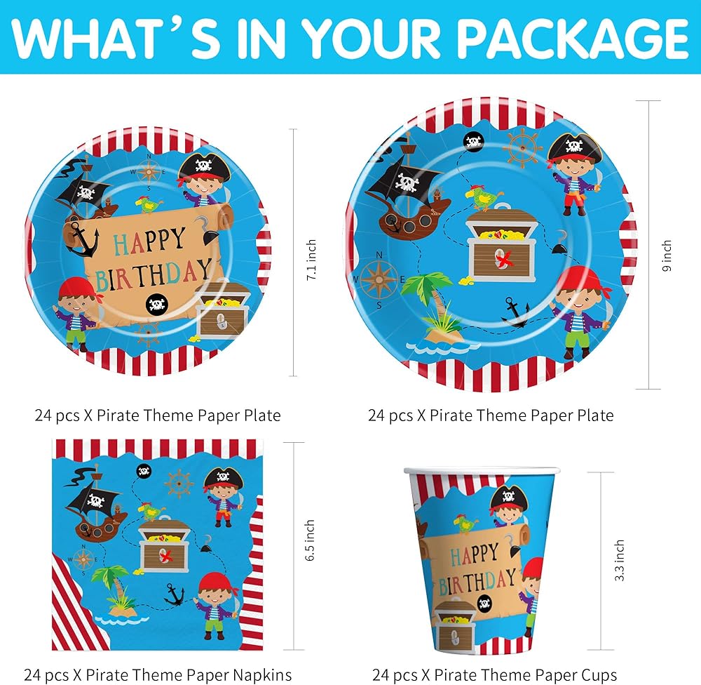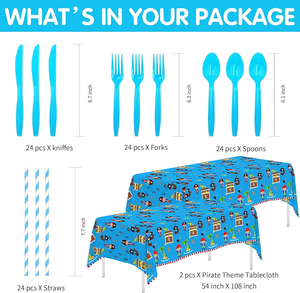 【Pirate Decorations Party】Our pirate party supplies tableware included 24pcs 9'' pirate dinner plates, 24pcs 7'' pirate dessert plates, 24pcs pirate napkins, 24pcs party cups, 24set cutlery, 24pcs paper straws, 2pcs pirate tablecloth, for boy's pirate theme party decorations