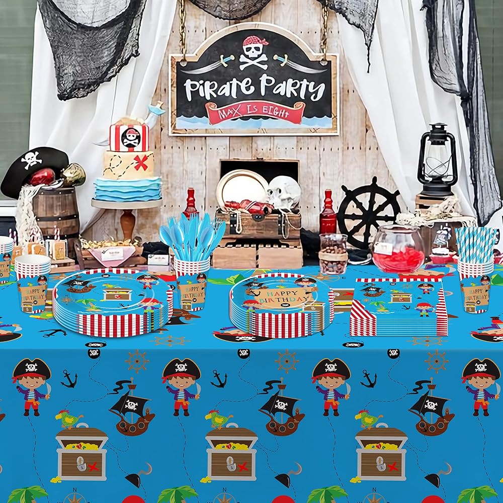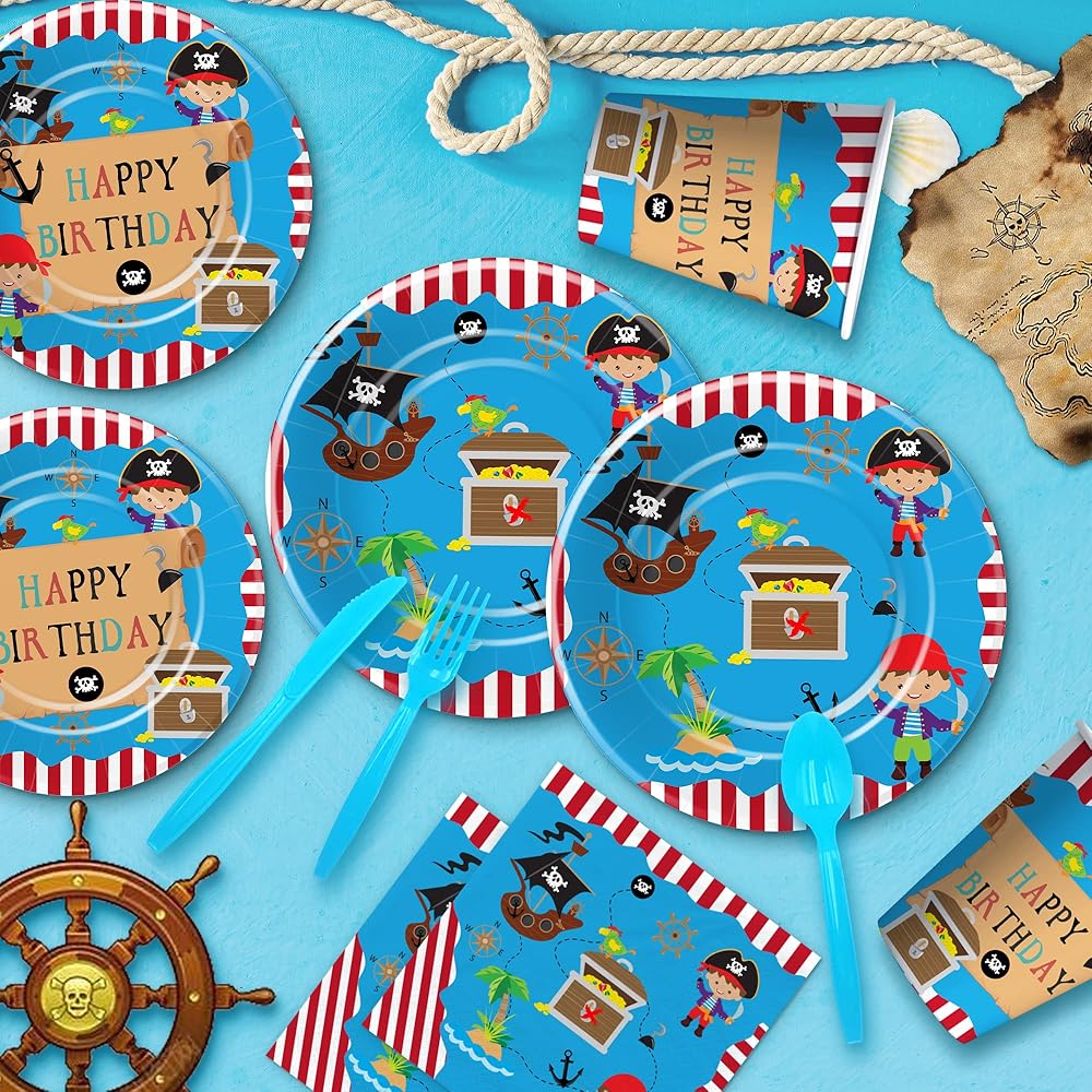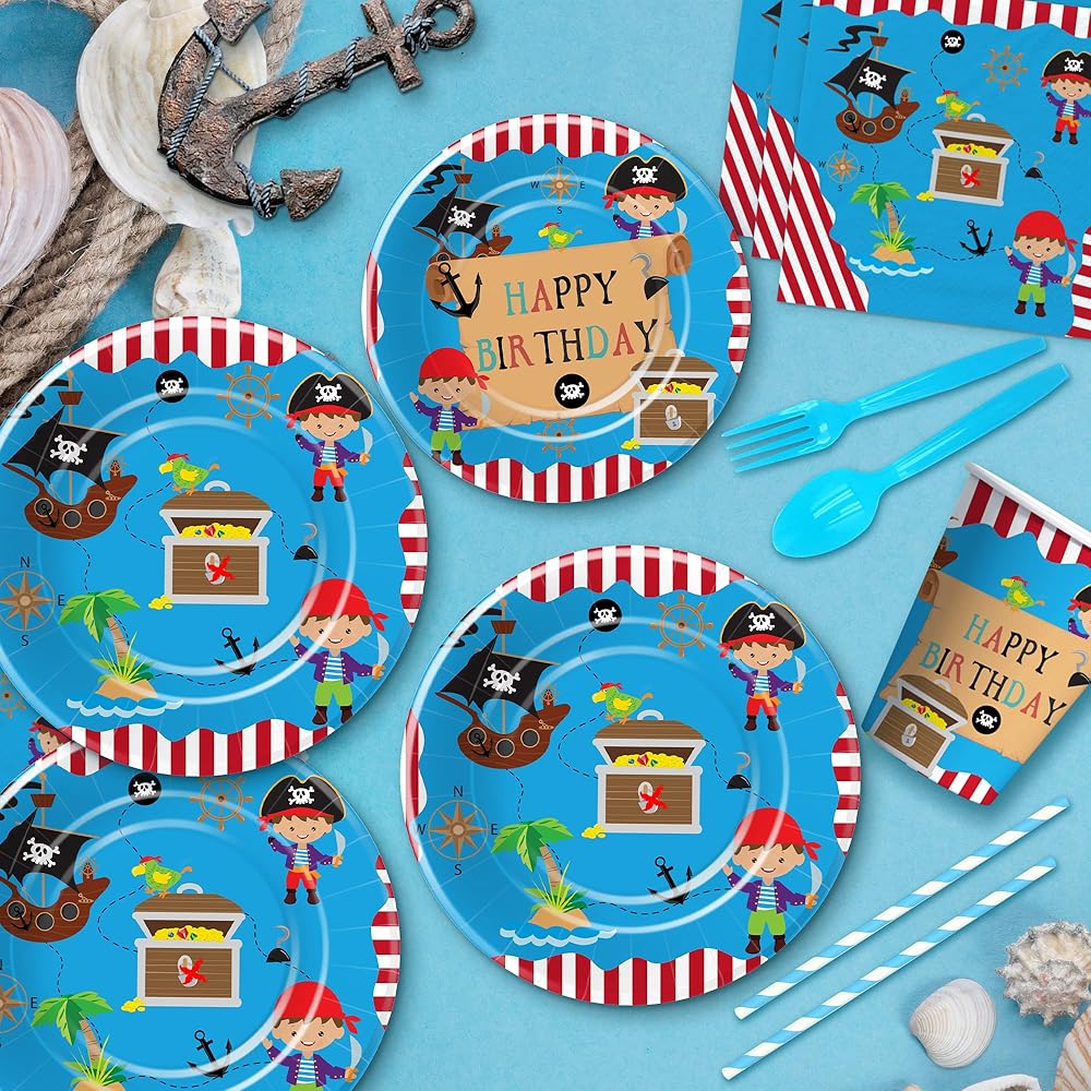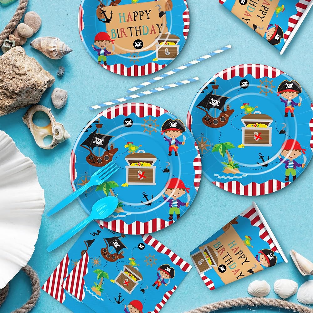 【Pirate Birthday Decorations】This nautical pirate-themed tableware features a cute, colorful design with a skull and crossbones, a pirate ship, and other seafaring motifs. Make your child's pirate party a swashbuckling success with our pirate party tableware