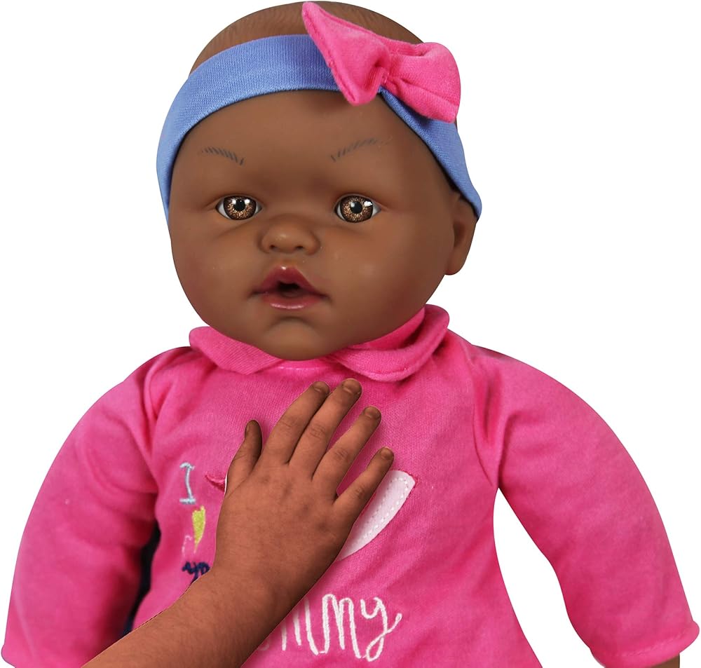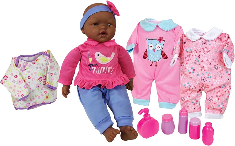 تأتي دمية الطفل الأمريكية الأفريقية الرائعة مقاس 15 انش مرتدية قميص ملون وسروال مع شريط رأس. تصدر 6 أصوات أطفال مختلفة (ماما، بابا، مرحبا، وداعا، يضحك ويبكي). هناك 3 ملابس إضافية للعب التنكري. تأتي مع 5 ملحقات للعناية والتغذية.