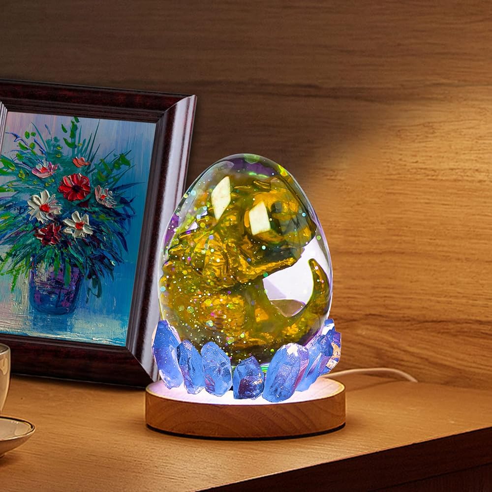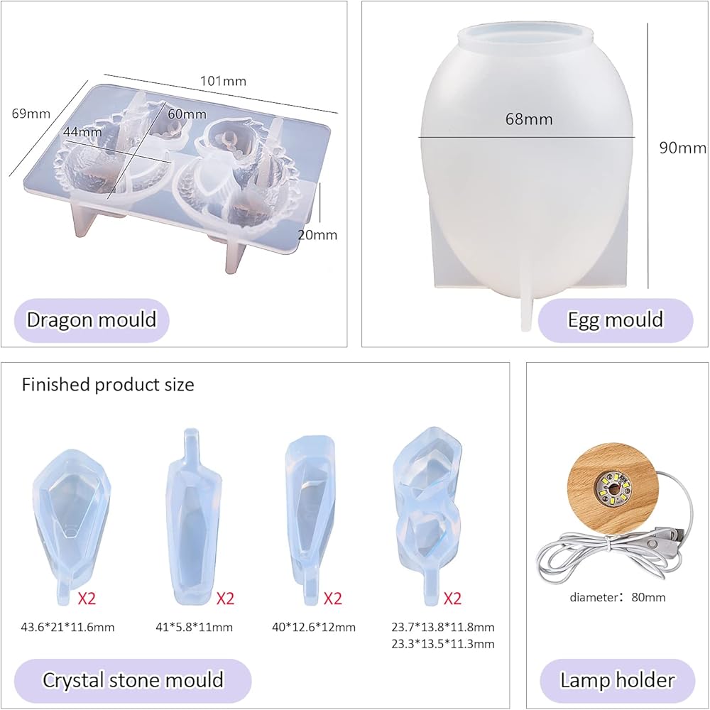 ما تحصل عليه: 1 × قالب ديناصور للأطفال، 1 × قالب سيليكون للبيض، 2 × مصباح LED بقاعدة خشبية (واحد يضيء باللون الأصفر وواحد يضيء باللون الأبيض). يرجى ملاحظة أن العبوة لا تتضمن ملحقات أخرى في الفيديو.