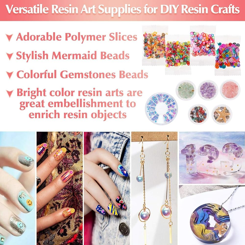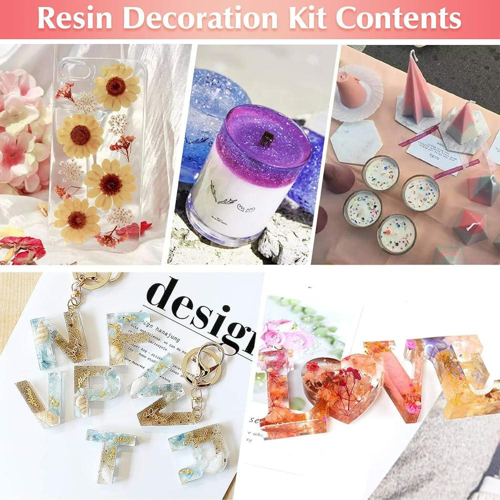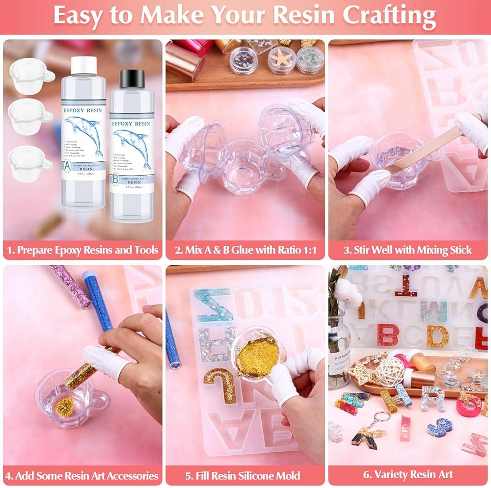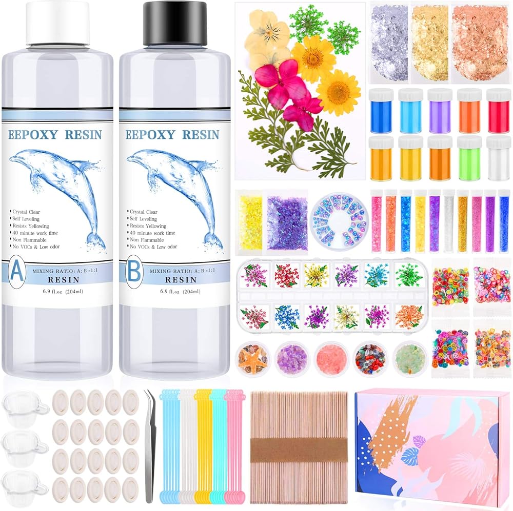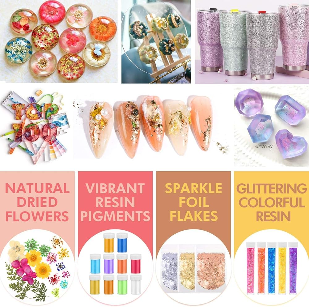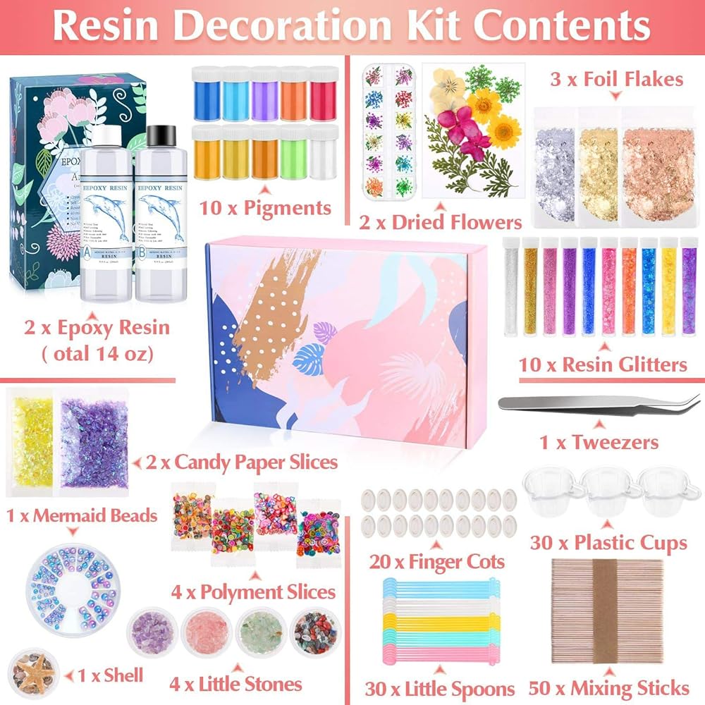 فن الراتنج الوفير خارج خيالك. راتنج ايبوكسي 14 اونصة لصنع المجوهرات، زهور للحرف اليدوية، رقائق رقائق الراتنج الذهبية، جليتر لقوالب الراتنج، أصباغ ملونة الراتنج، شرائح بوليمر ثلاثية الأبعاد، شرائح ورق الحلوى والأحجار الصغيرة اللطيفة، إلى جانب مجموعة تزيين الراتنج القيمة، الكثير من أدوات الراتنج للحرف اليدوية. أنت تستحق امتلاك مجموعة ملحقات الراتنج الكاملة.