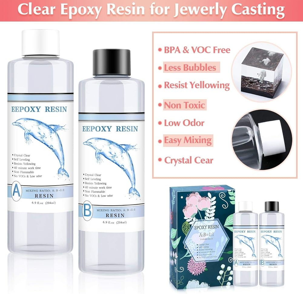 راتنج الايبوكسي لصب راتنج المجوهرات - يأتي مع زجاجتين من راتنج الايبوكسي الشفاف 8 اونصة، يتميز بأنه خالٍ من البيسفينول ايه وغير سام وفقاعات أقل ومقاوم للاصفرار، ينتج مصنوعات راتنج شفافة ذات لمعان عالٍ. استخدام الراتنج الشفاف بسيط، امزج الايبوكسي الشفاف ايه وبي بنسبة 1:1، ثم حركه بالتساوي ويمكنك البدء في فن صب الراتنج