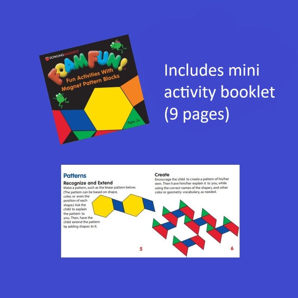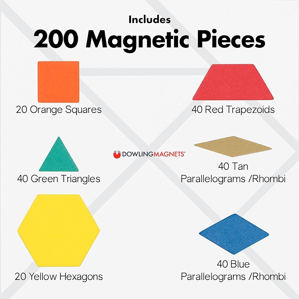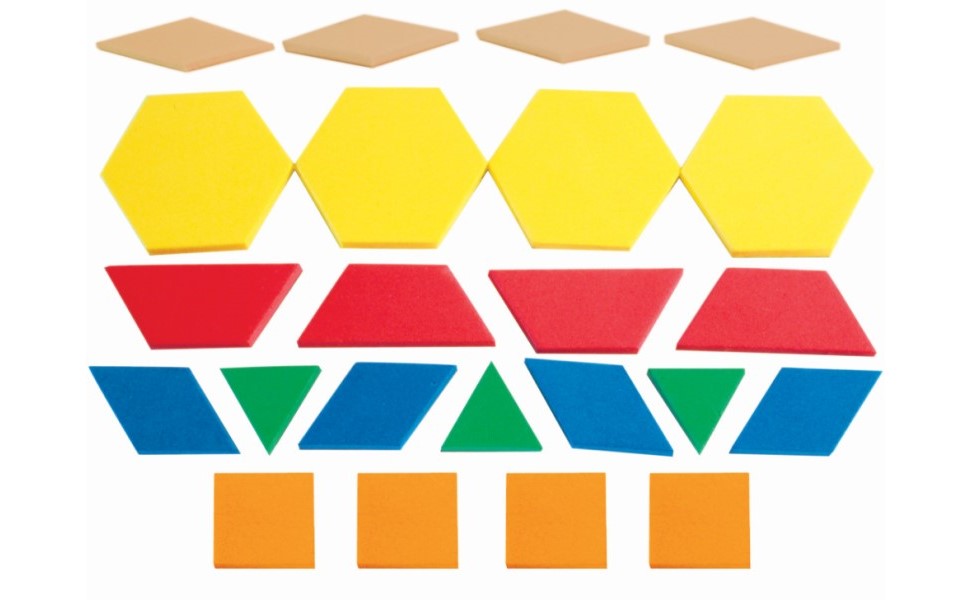 20 قطعة من كل من الأشكال السداسية الصفراء والمربعات البرتقالية. 40 مثلث أخضر شبه منحرف أحمر متوازي الأضلاع الأزرق والمعين الأبيض مع كتيب الأنشطة.