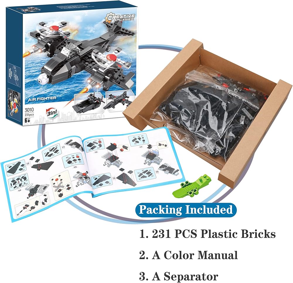 مجموعات بناء الطائرات المقاتلة 3 في 1 من tblicked، مجموعة بناء الطائرات الحربية العسكرية، مجموعة ألعاب بناء طائرات حربية عسكرية، مجموعة لعب السفن الحربية، هدية للأطفال الذين تتراوح أعمارهم بين 6 و12 عامًا، 231 قطعة