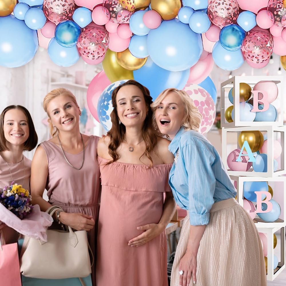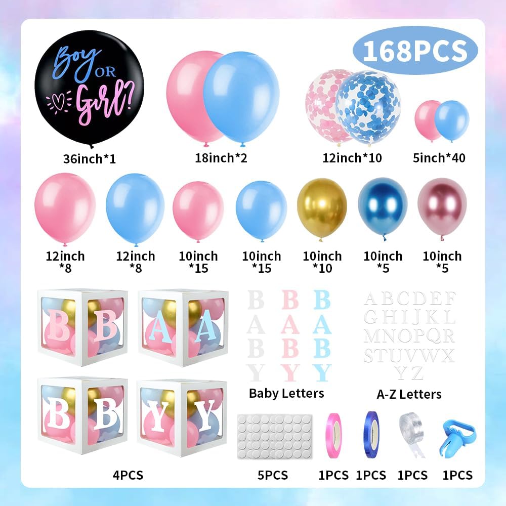 Abundance Gender Reveal Decorations Kit: Our package includes 4pcs baby boxes, 3 sets of "BABY" letters(blue, pink and white), 1 set of A-Z letters, 1pcs 36" boy or girl balloon, 82pcs pink and blue balloons (18"+12''+10' +5''), 8pcs 12" pink confetti balloons, 8pcs 12in blue confetti balloons, 10pcs 10" metallic gold balloons,10pcs 10" metallic pink balloons,10pcs 10" metallic blue balloons, tying tool, pink and blue ribbon, glue points and balloon arch strip.