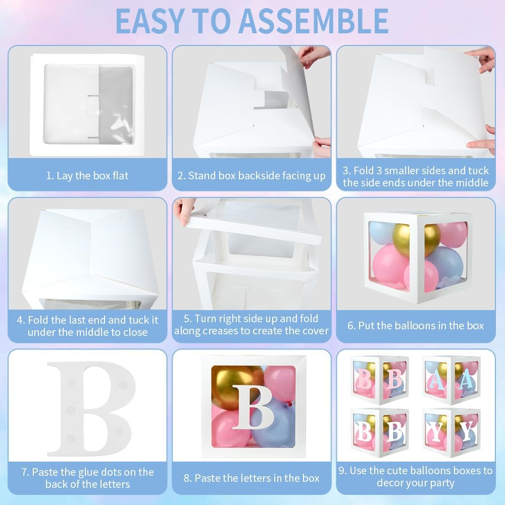 Easy to Assemble: The white clear baby shower box is pre-folded and very easy to install. The installation steps are shown in the product picture. Comes with BABY letters in three colors and A-Z letters in white, so you can get creative and DIY a unique gender reveal box decoration for your party. Equipped with a set of balloon tools, it can free your hands and help you make beautiful balloon arches more easily and quickly.