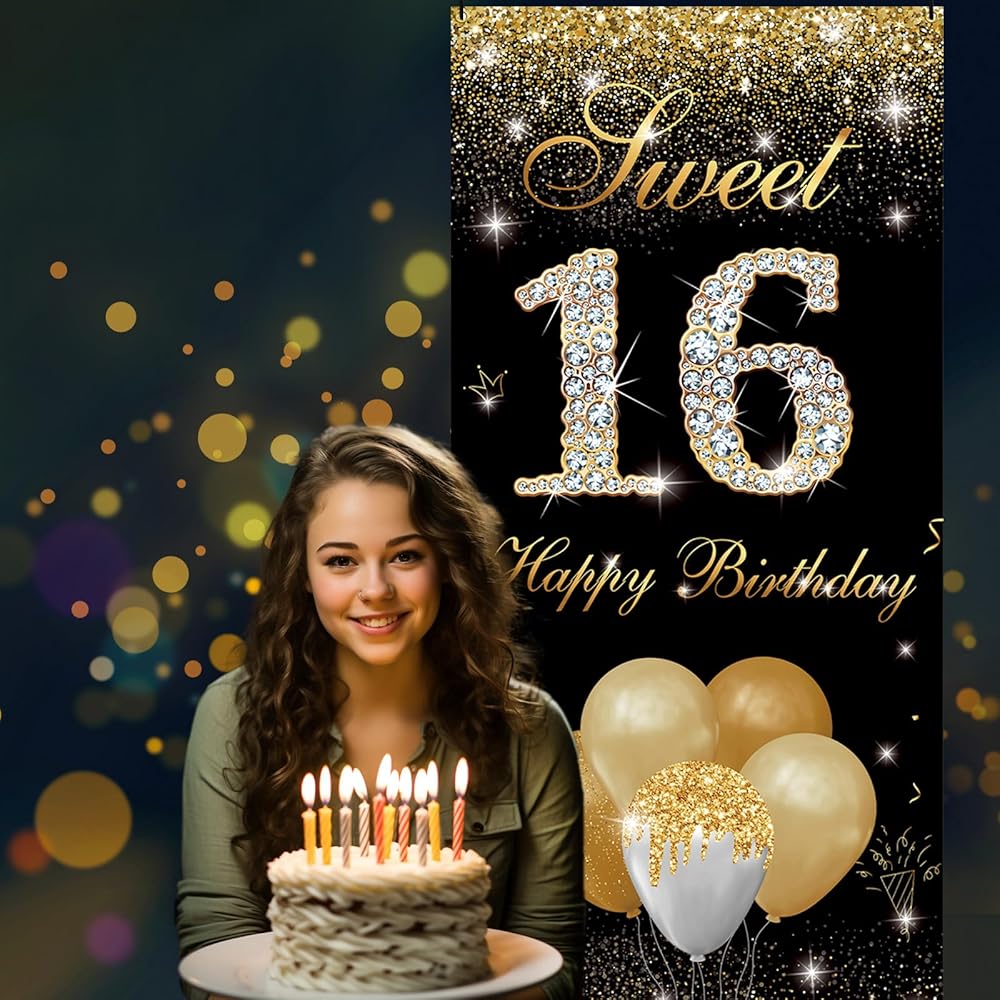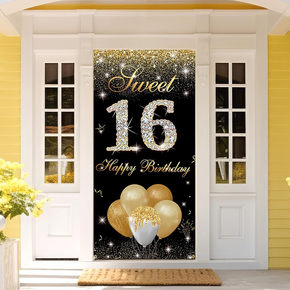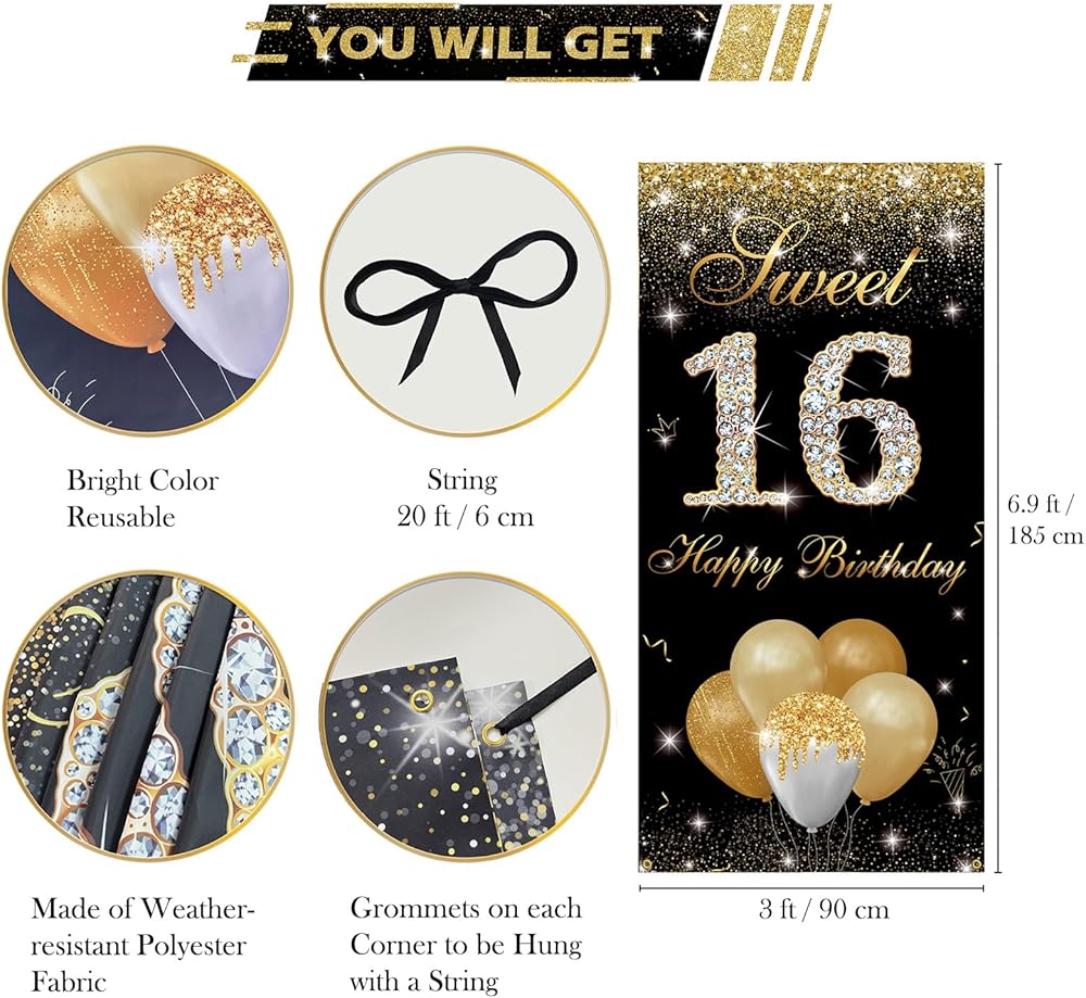 زينة عيد الميلاد السادس عشر للاولاد والبنات من اتش تي دي زد زد زد اي - لافتة باب عيد ميلاد 16، لافتة ساحة، خلفية دعائم صور، لوازم ديكور حفلات اعياد الميلاد السادسة عشرة بلون اسود وذهبي من مادة قماشية،