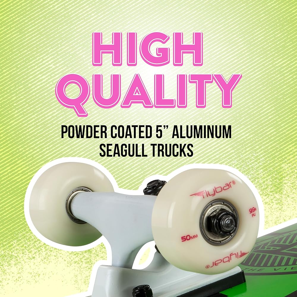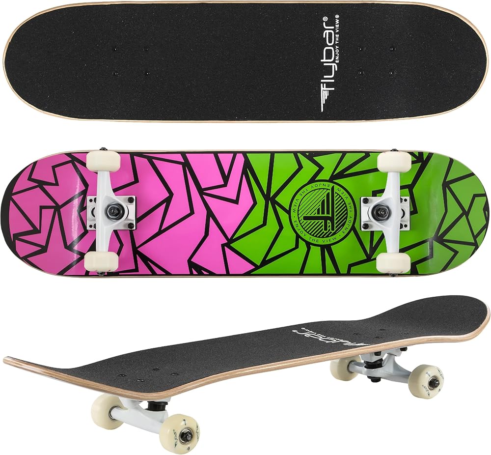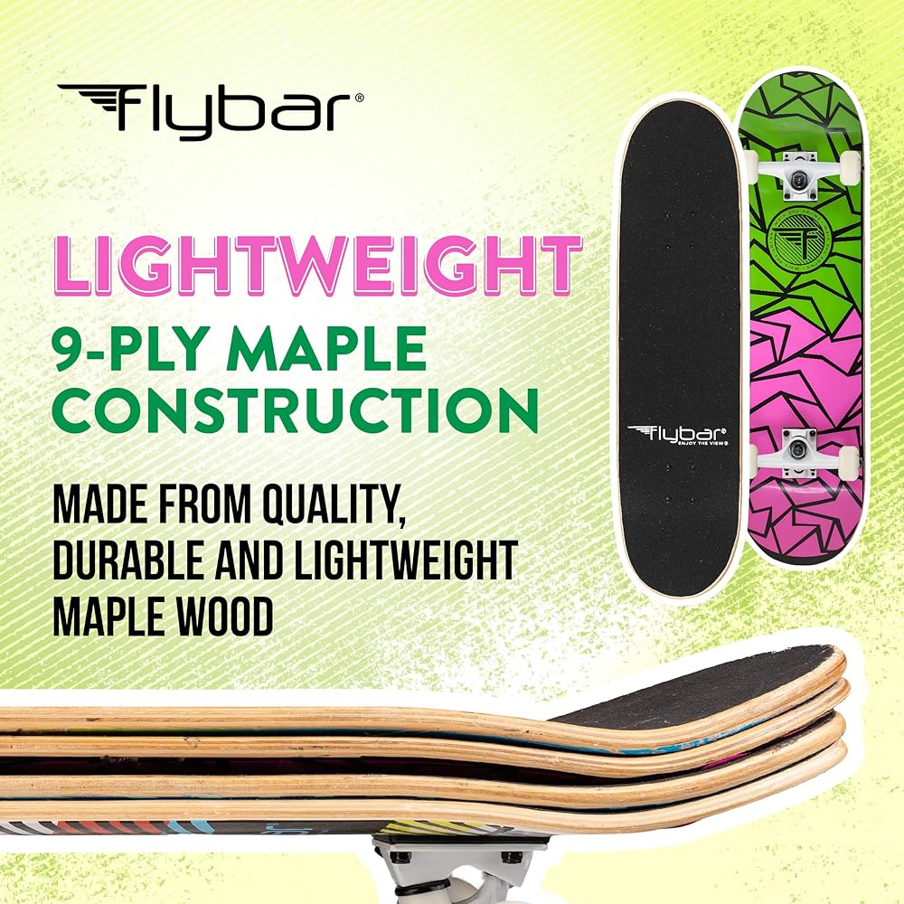 Flybar, Since 1918. Flybar has been making great sporting goods for nearly 100 years. Innovation, quality and fun is our ongoing legacy. Our premium skateboards continue the Flybar tradition of providing great products for great experiences. Whatever you do on Flybar, remember to ENJOY THE VIEW! Features of Flybar Complete Skateboards. Our decks are a 31” x 8” concave board making it a perfect size for a skater at any level. Great for a beginner skater learning new tricks or advanced rider looking for new complete skate board. Pre-built complete standard skateboards ready to go right out of the box! Don't worry about buying all the trucks, bearings, grip tape and wheels for your board. Made with top quality parts. This 8 inch wide skateboard is awesome to cruise and do advanced tricks on. Not only do you get a great complete skateboard, but a great price as well. Weighing in at only 5 pounds, this skateboard complete is very lightweight so you can easily nail any trick you want. No heavy trucks weighing you down. Wheel base: 17.5” 50mm Flybar PU Wheels & Flybar ABEC 7 Bearings give you a smooth ride. They perfectly assist your trucks and improve your skateboarding experience. Great skateboards for teens, kids, and adults. Drop in with a brand new Flybar Skateboard!