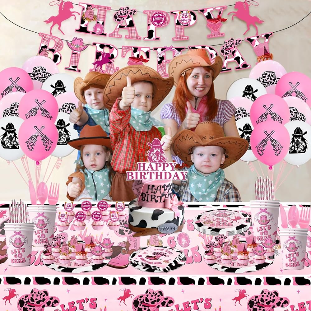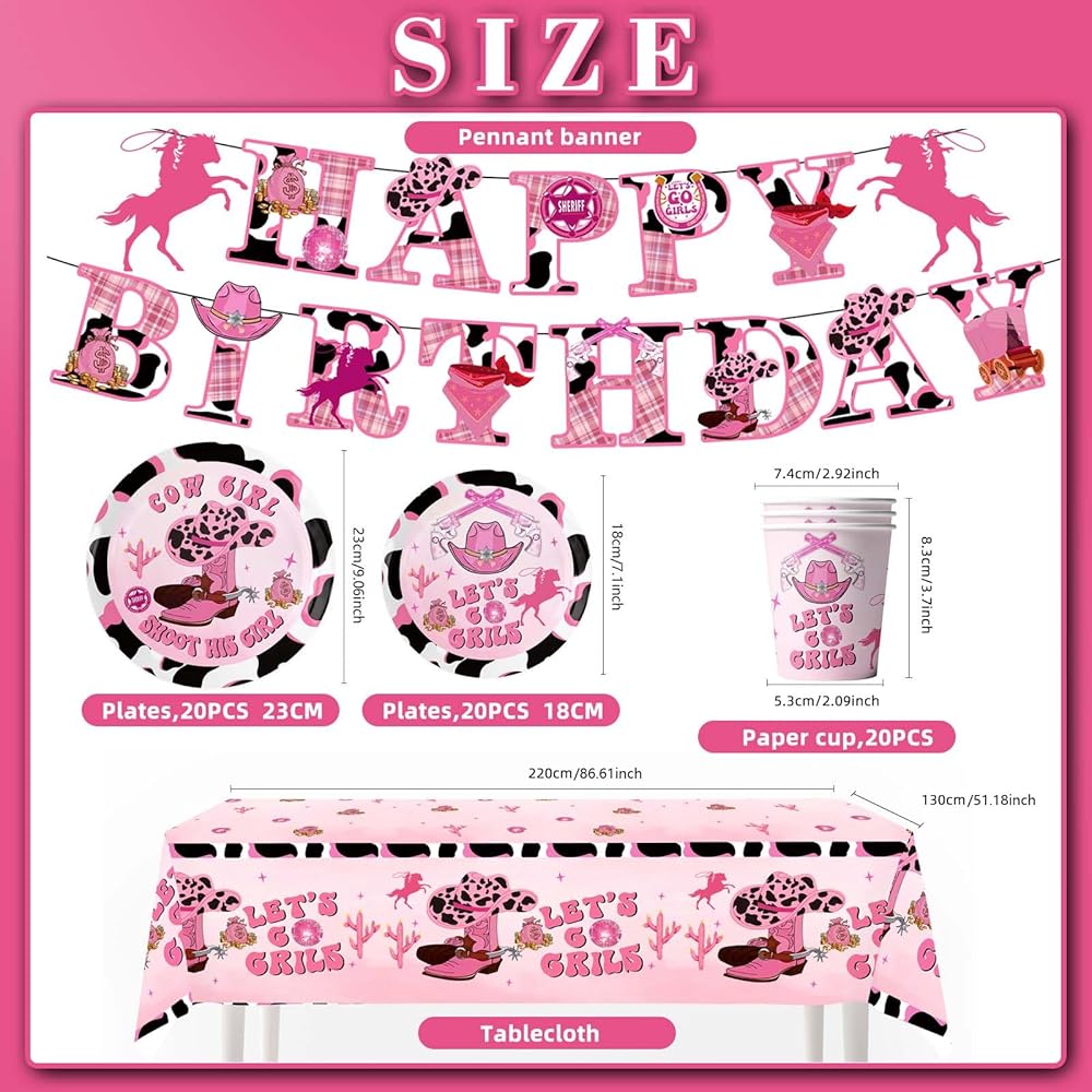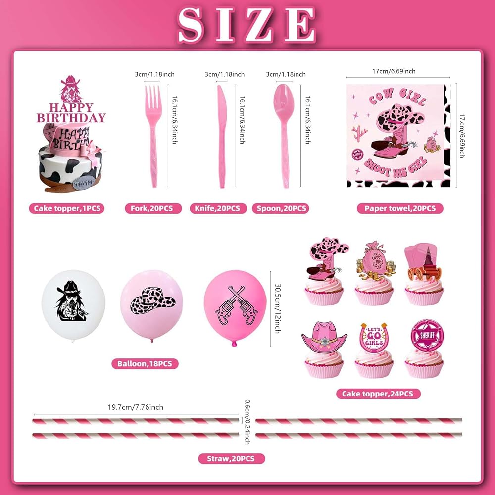 Decorations Package: This pink cowgirls party theme kit include 20 7" football plates, 20 9" inch football plates, 20 6.5" inch paper napkins, 20pcs Forks Knives Spoons, 20pcs straw, 20pcs cups (blending 2 designs), 2 banner sets , 18pcs Latex Ballons, 1pc Cake Topper, 24pcs Cupcake Toppers, and 1pc 51" x 86"pink jazz hat style tablecover . This will be perfect to decorate your party!