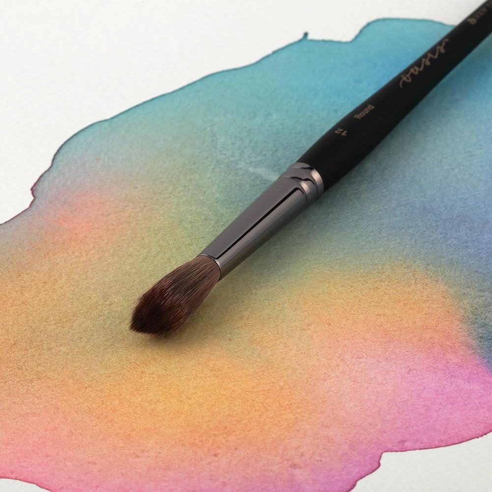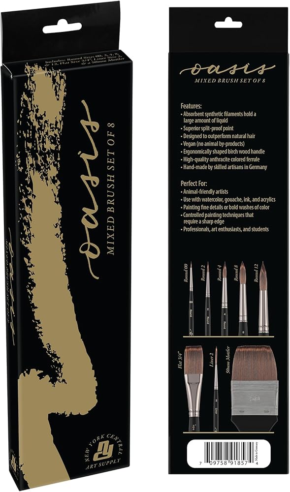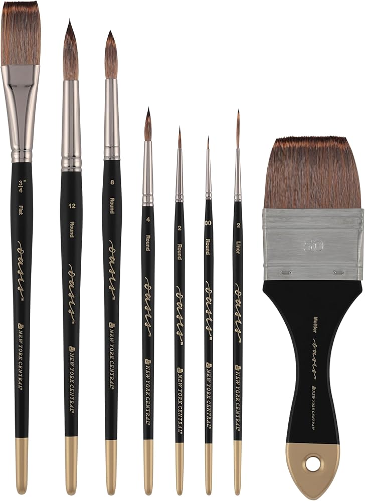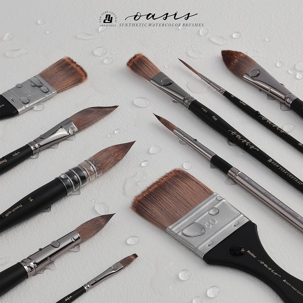 Elite Professional Watercolor Brushes - Nature, Improved! The New York Central brush makers didn't just try to imitate the characteristics of Natural hair they set out to create something superior and succeeded with Oasis! The brushes were created by combining centuries of brushmaking knowledge with the latest technology. Each brush is made by blending different filament diameters, taper ratios, and lengths. A computer simulation determines the precise combination of filaments before Each brush is assembled by hand. Over 30 types of synthetic hair are blended to accurately imitate Natural hair. This attention to detail results in a soft, extremely absorbent brush that holds its shape well and has great snap. One of the first brushes Designed using computer simulation for every single brush. This will outshine virtuAlly All brushes! Each brush has the optimal combination of hair to maximize its performance. This yields a uniform brush response and Color-holding ability. Oasis brushes are extremely thirsty and can hold a large amount of water and Paint compared to other brushes. After working with these brushes, you will be amazed by how well they perform.