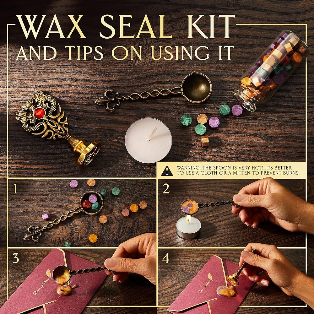 أضف اللمسة النهائية: قم بختم رسالتك بنفس الطريقة التي اعتاد عليها اللوردات والملوك! مع مجموعة ختم الشمع المتضمنة، لديك كل ما تحتاجه لإرفاق رسالتك في ظرف فاخر (متضمن أيضًا في العبوة). في مجموعة أقلام الريش هذه نوفر لك مجموعة متنوعة من الشمع الملون للاختيار من بينها أو للمزج. ما عليك سوى إذابة الشمع في ملعقة الذوبان الأنيقة، ثم صبه على الظرف، واستخدم الختم بتصميم مقبض التنين الغامض وزخرفة ختم فلور دي ليز الكلاسيكية (الزنبق الشعاري).
