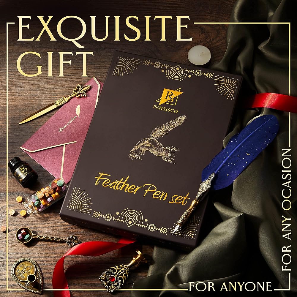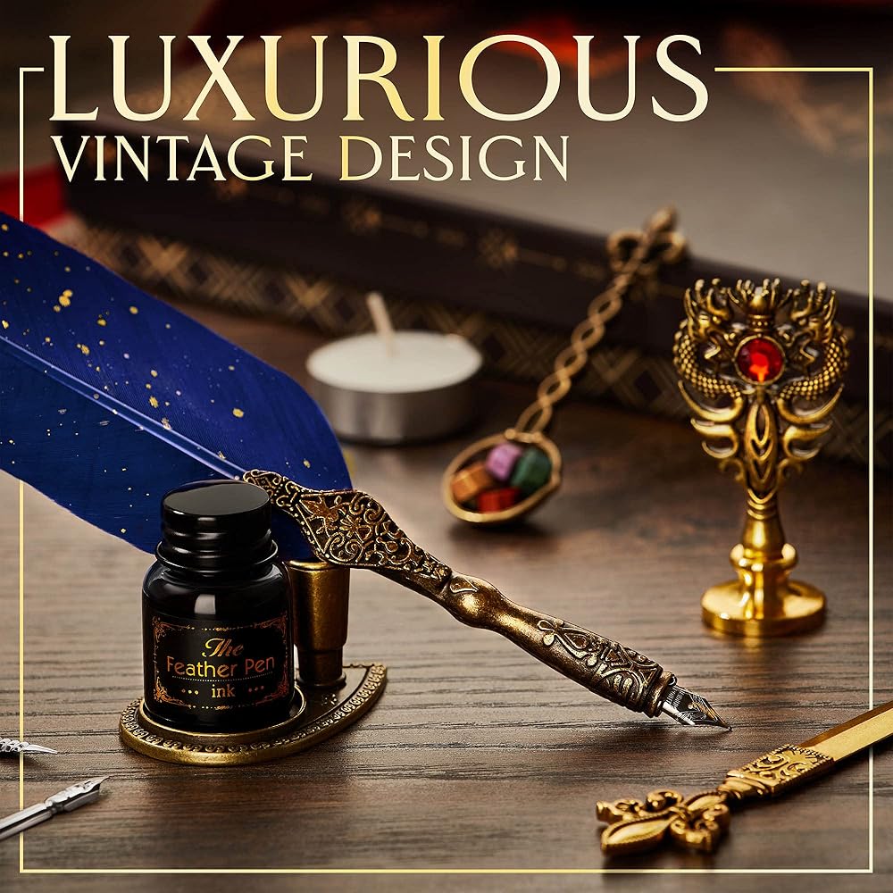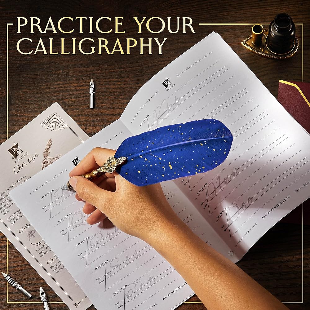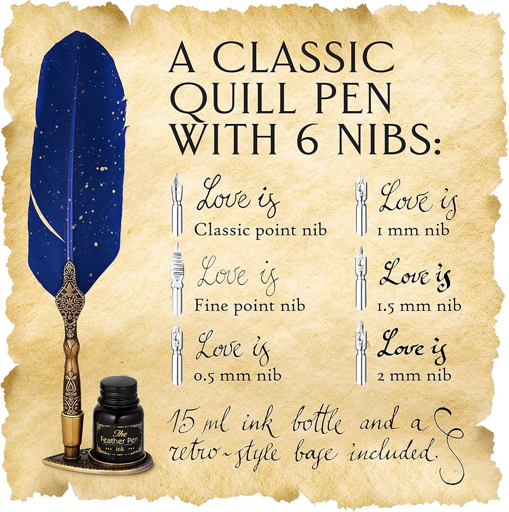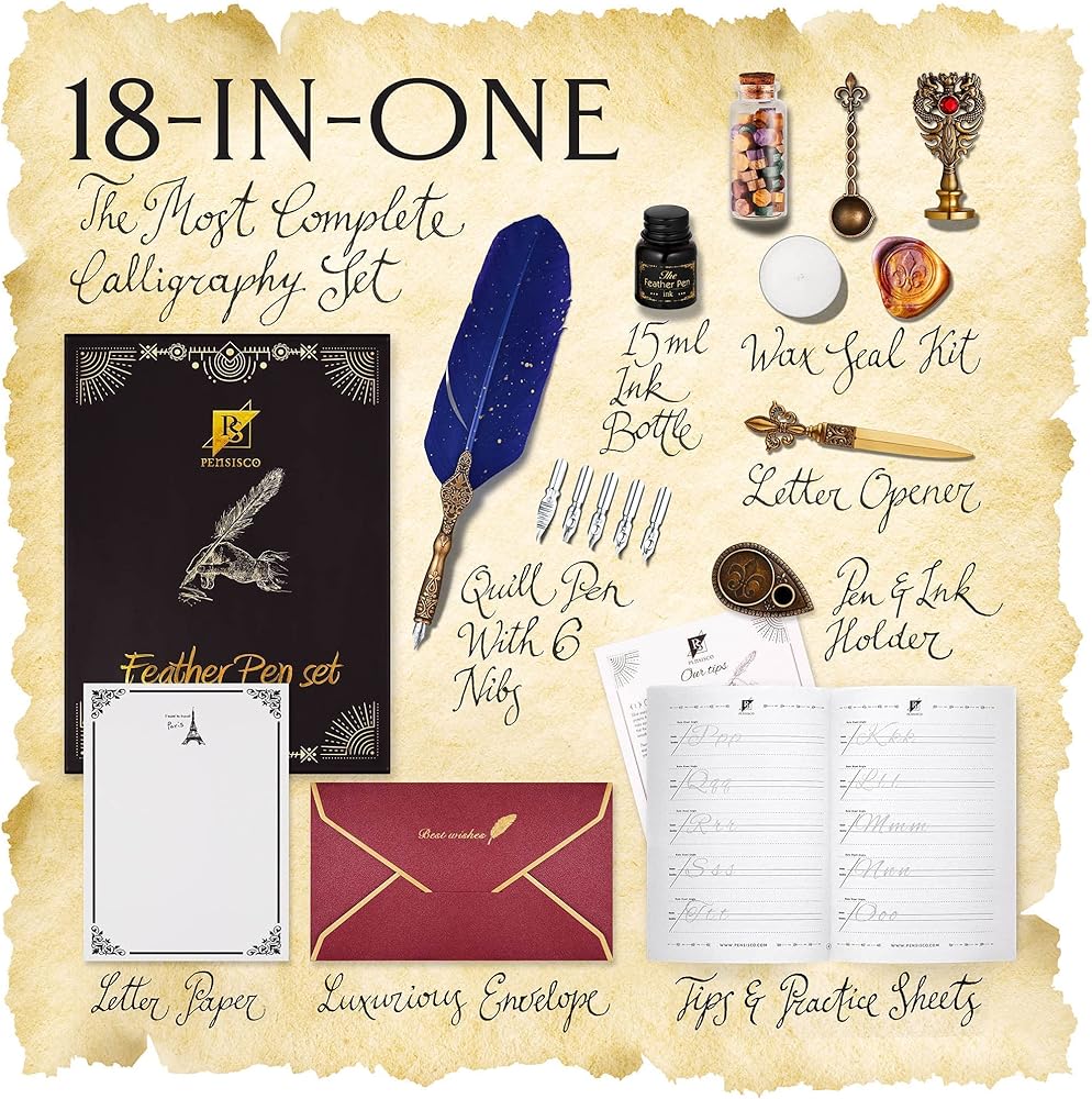 أفضل مجموعات أقلام الريش للمبتدئين! استمتع بممارسة الخط مع مجموعات أقلام الخط العتيقة الجميلة لدينا! مجموعة أقلام الريشة هذه المصممة جيدًا والمصنوعة بمهارة هي مجموعة الخط الأكثر اكتمالًا المكونة من 18 في واحد والتي تتضمن قلم ريشة أنيق وزجاجة حبر بالخط سعة 15 مل مع قاعدة حامل، و6 سنون فولاذية عالية الجودة قابلة للاستبدال، وختم ختم ومجموعة ختم الشمع وفتاحة رسائل ومظروف فاخر وورق رسائل وحتى نصائح وأوراق تدريب لجعل تعلم الخط أمرًا ممتعًا!