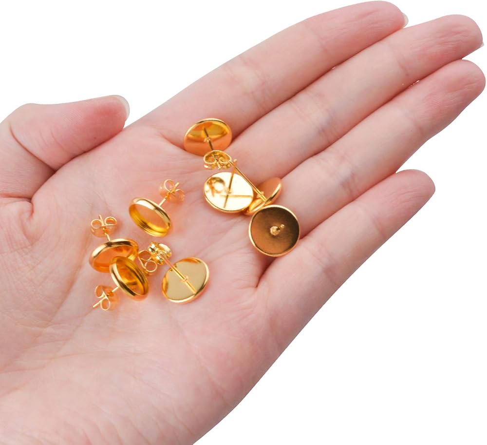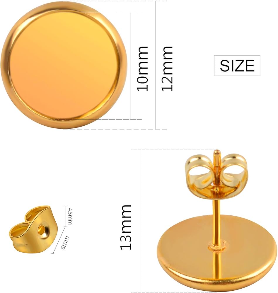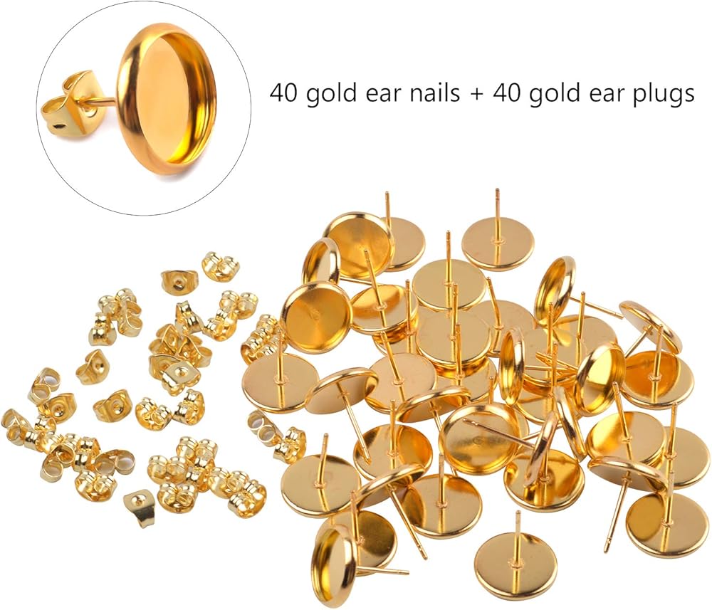 Jdesun 40 قطعة من الأقراط المصنوعة من الفولاذ المقاوم للصدأ على شكل كابوشون لوضع الأكواب مقاس 10 مم و40 قطعة من الأقراط الآمنة، لون ذهبي