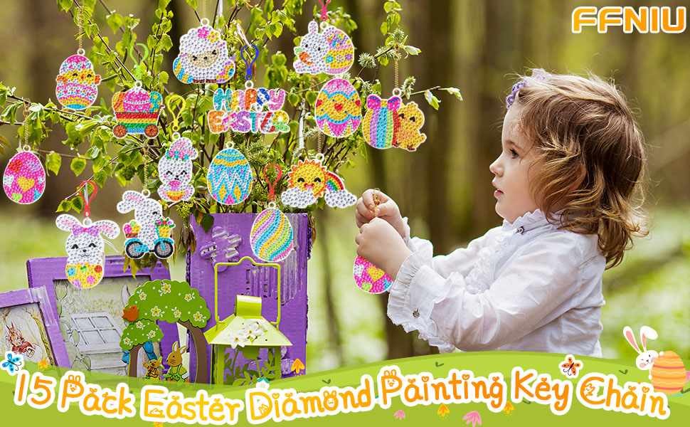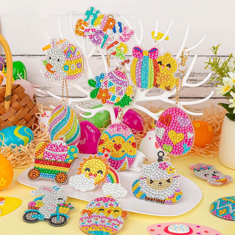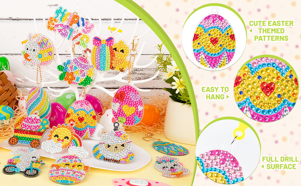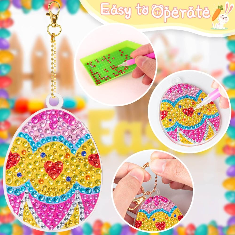 【DIY DIAMOND PAINTING】This easter diamond art kit can improve your child's hands-on skills, color matching, develop concentration and joyful self-discipline, DIY your own unique gemstone keychain.