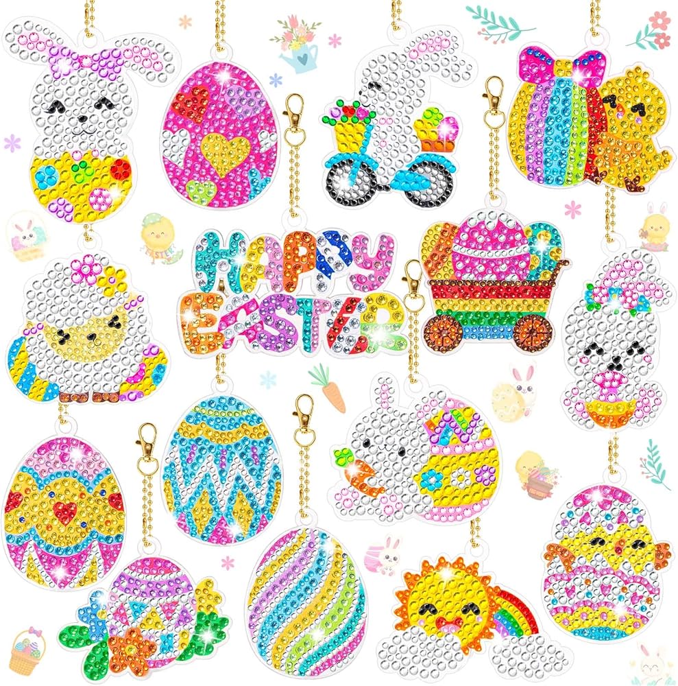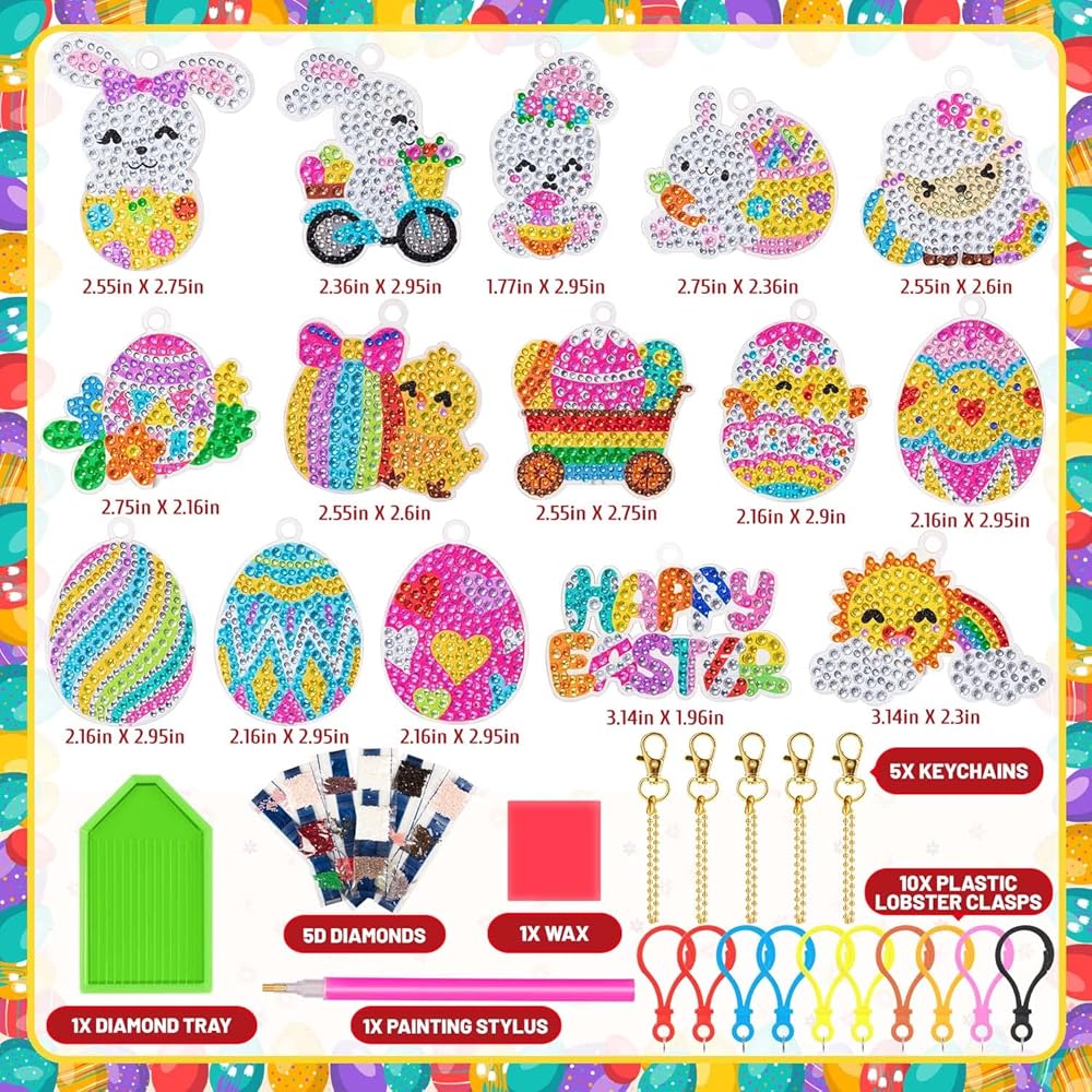 【EASTER DIAMOND PAINTING KEYCHAINS】The package includes 15 metal lobster clasp keychains, 15 acrylic easter diamond painting ornaments, 1 diamond trays, 1 diamond styluses, 1 square waxes and plenty of diamond dots, enough to meet your DIY needs.