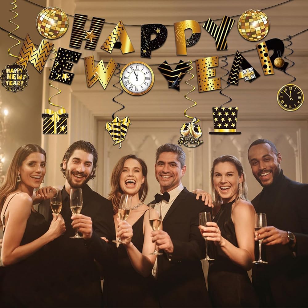 【Adorable colors new years party decorations】The Happy New Year banners hanging swirls are designed by gold and black cutouts which will,single and double spirals embellishments in gold and black, shiny twinkle foil decors will give your guests unforgettable memories.