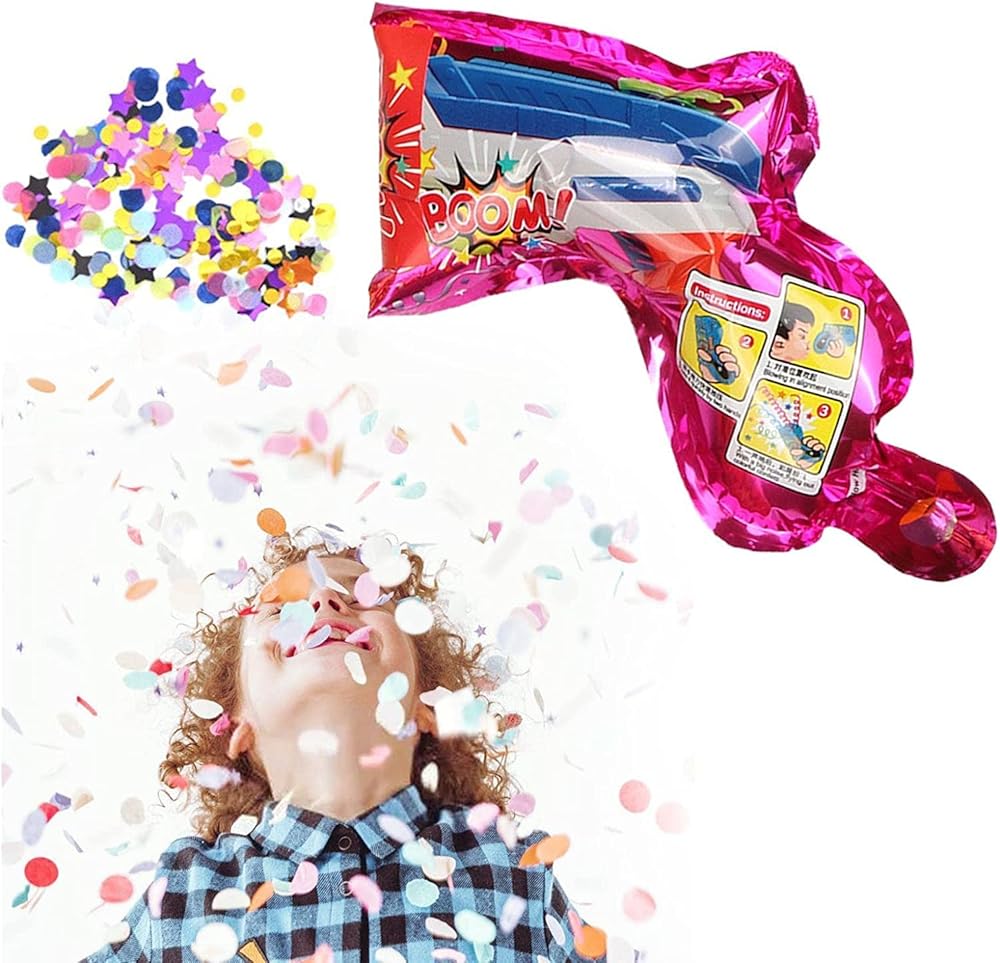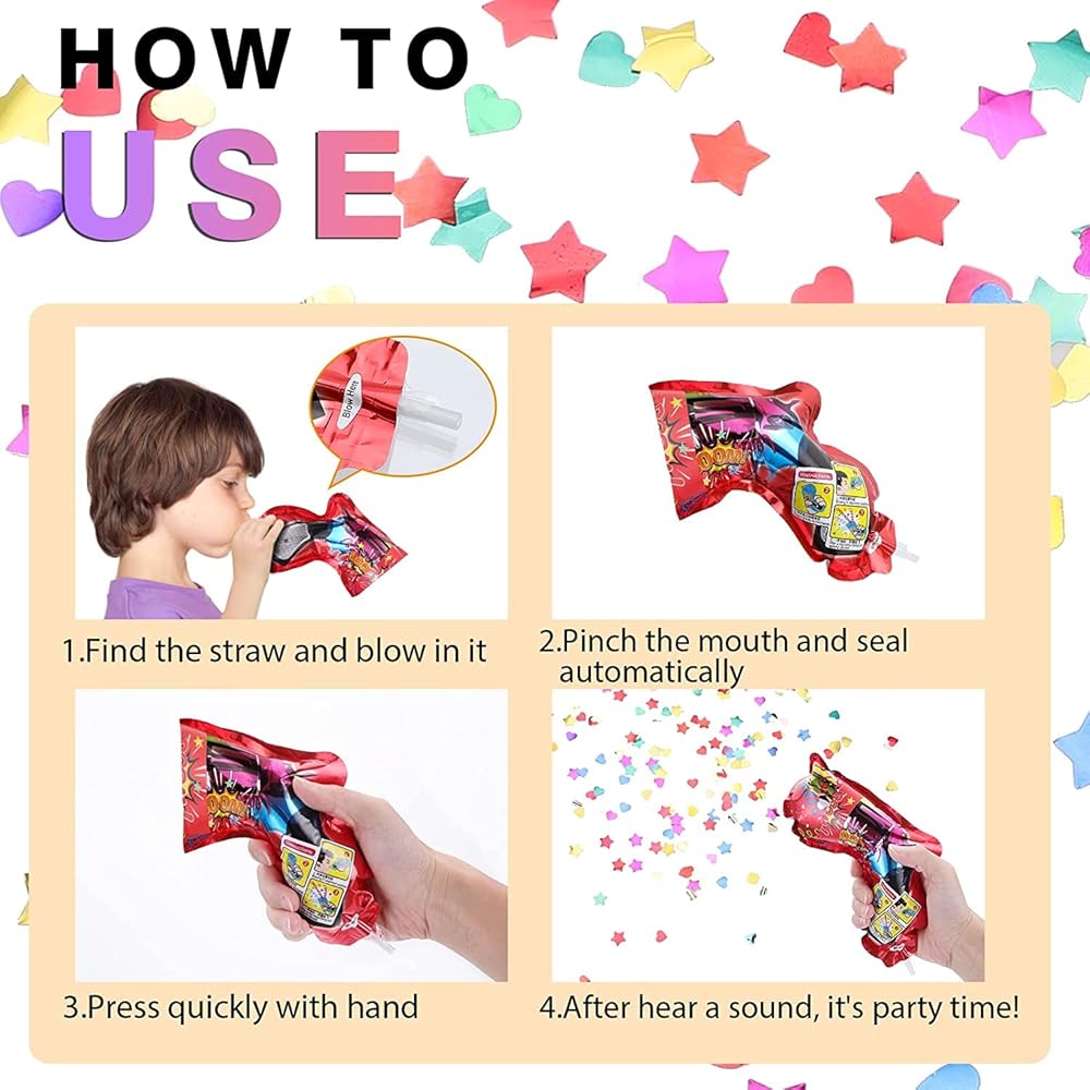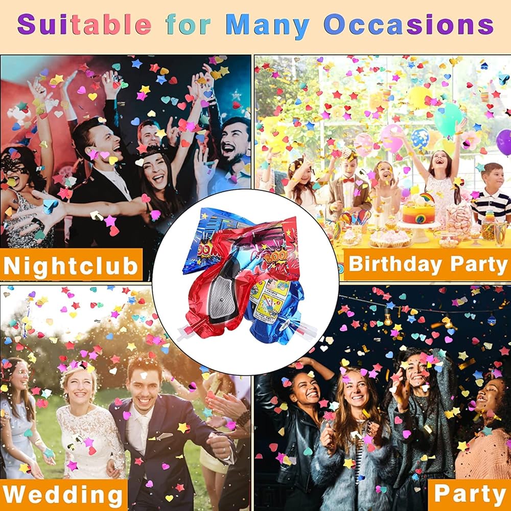 -- Toy confetti popper, easy and fun for kids to use. Pop hearts, stars, and circles of confetti. The height will be 1 meter away.