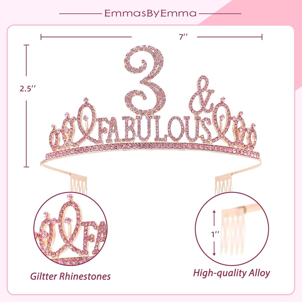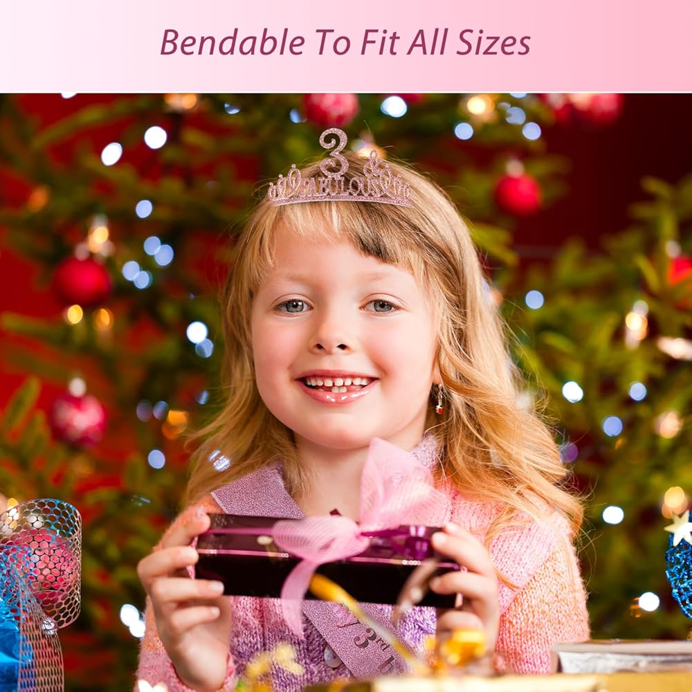EBE EmmasbyEmma وشاح عيد الميلاد الثالث وتاج للفتيات - وشاح لامع رائع + تاج معدني رائع من حجر الراين الوردي الفاخر للفتيات، هدايا عيد الميلاد الثالث لحفلة الأميرة