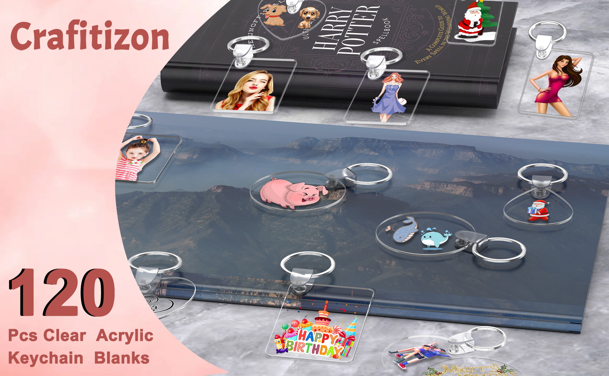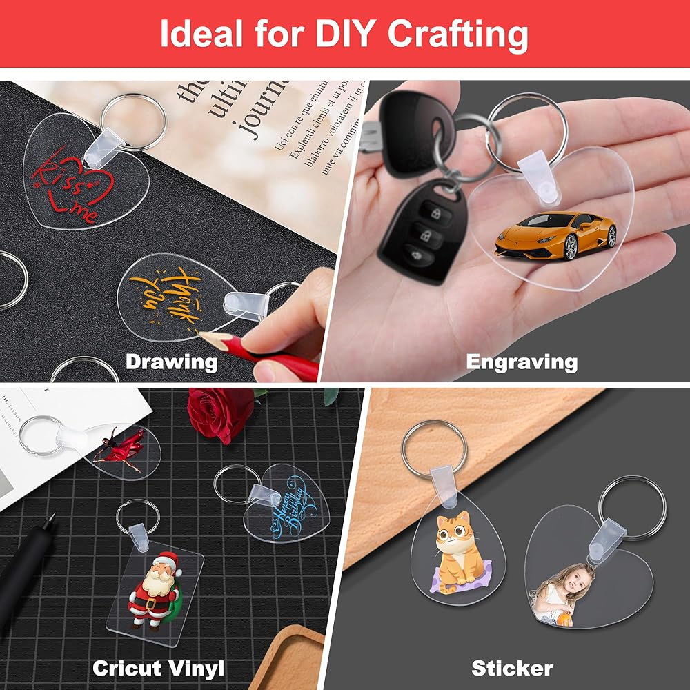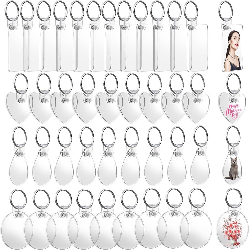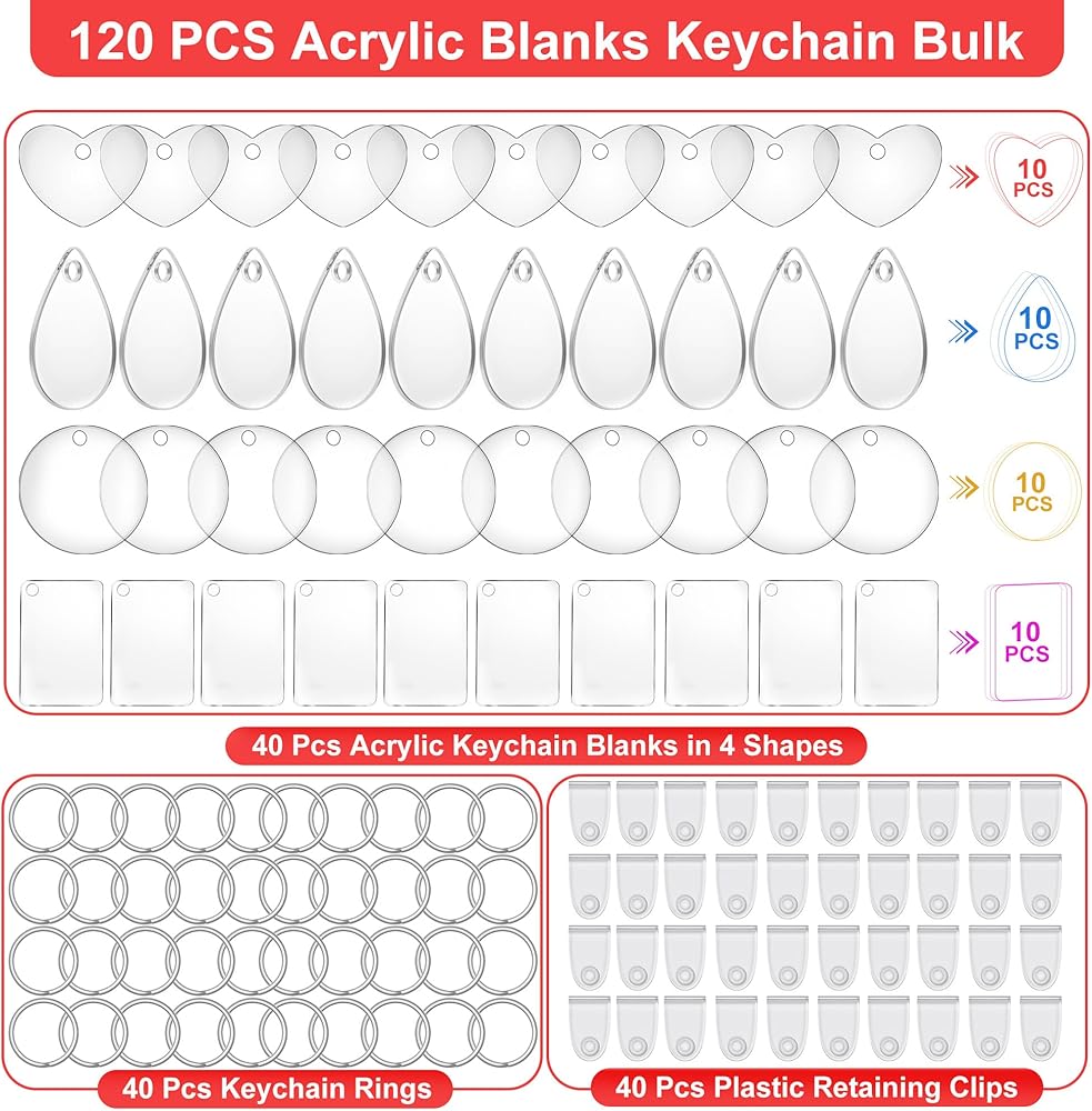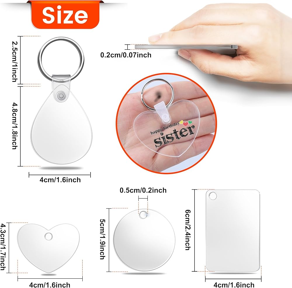 120 قطعة من فراغات سلسلة المفاتيح الأكريليك، 4 أشكال من سلاسل المفاتيح الفارغة الشفافة لمجموعة الفينيل، فراغات سلسلة مفاتيح مطبوعة على الوجهين، لوازم سلسلة مفاتيح DIY مع حلقات مفاتيح للحرف اليدوية وصنع المجوهرات
