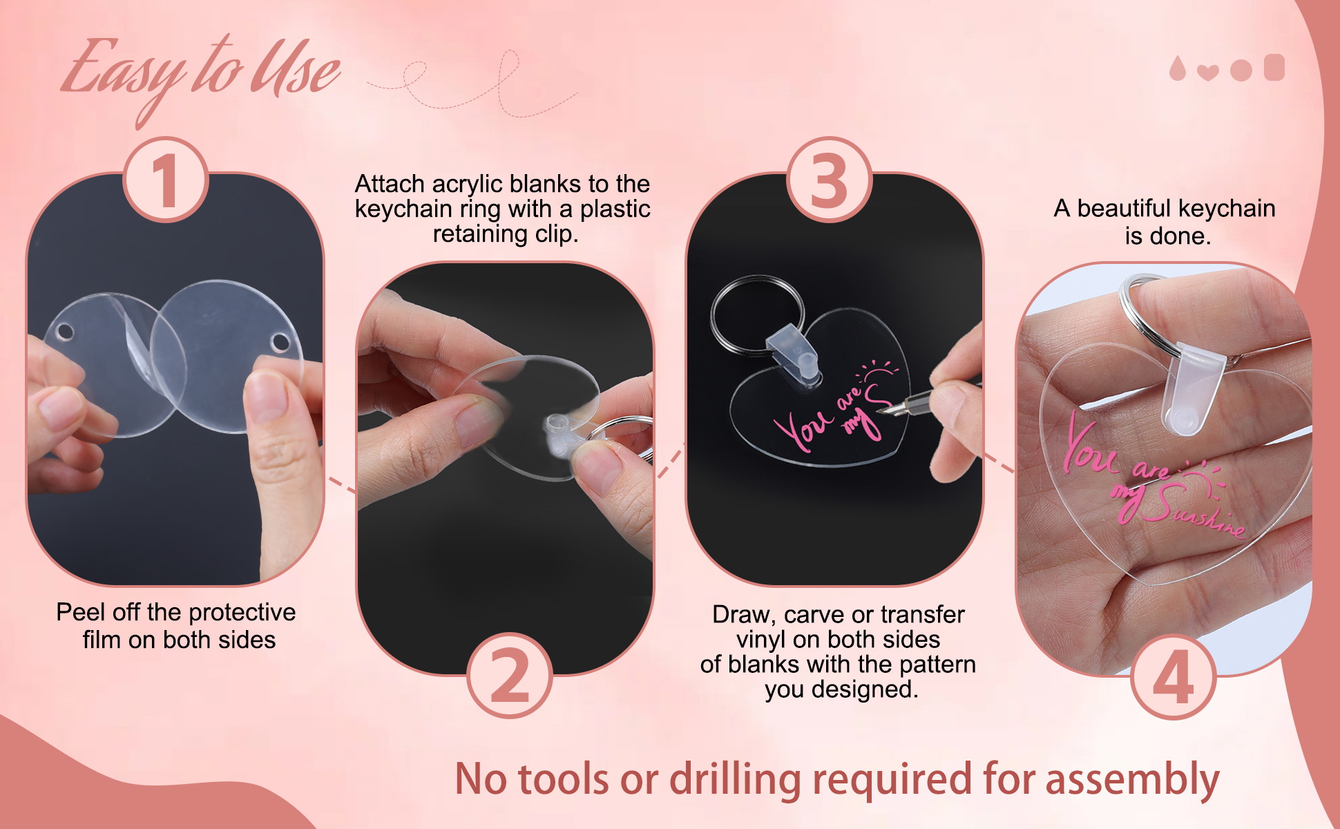 【فيلم واقي على الوجهين وسهل الاستخدام】 يتم تغطية الجزء الأكبر من سلسلة المفاتيح الأكريليك هذه بطبقة واقية على كلا الجانبين لتجنب خدوش السطح، وهي مريحة للتخزين، يرجى تمزيقها عند استخدامها. بالمقارنة مع مجموعة فارغة سلسلة المفاتيح التقليدية، مع مشابك الاحتفاظ المبتكرة، يمكنك بسهولة تجميع سلاسل المفاتيح الخاصة بك بنفسك بدون كماشة مجوهرات أو أي أدوات أخرى.