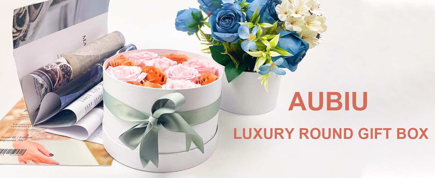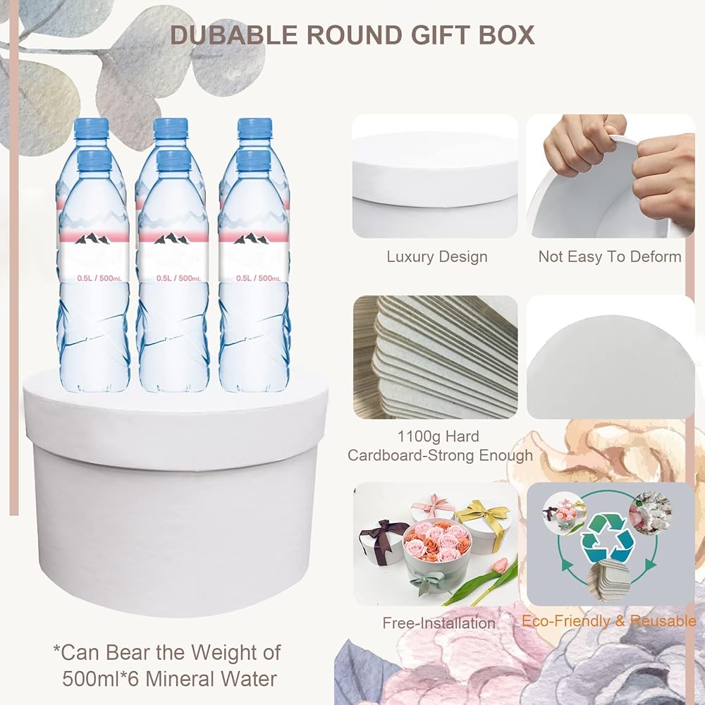 【مادة صديقة للبيئة】صناديق الهدايا البيضاء الخاصة بنا مصنوعة من ورق مقوى عالي الجودة 1100 غرام لكل متر مربع من الورق المقوى الصديق للبيئة، وهو أكثر سمكًا من الشائع ويمكن إعادة تدويره. عبوة صندوق الهدايا الكبيرة الفارغة قوية وموثوقة، صندوق دائري متين وقابل لإعادة الاستخدام.