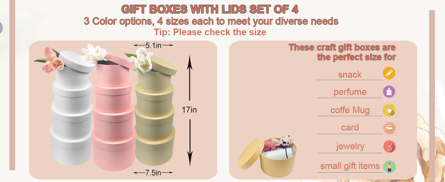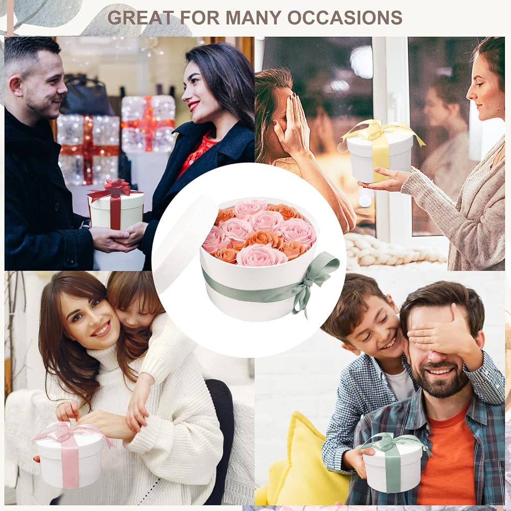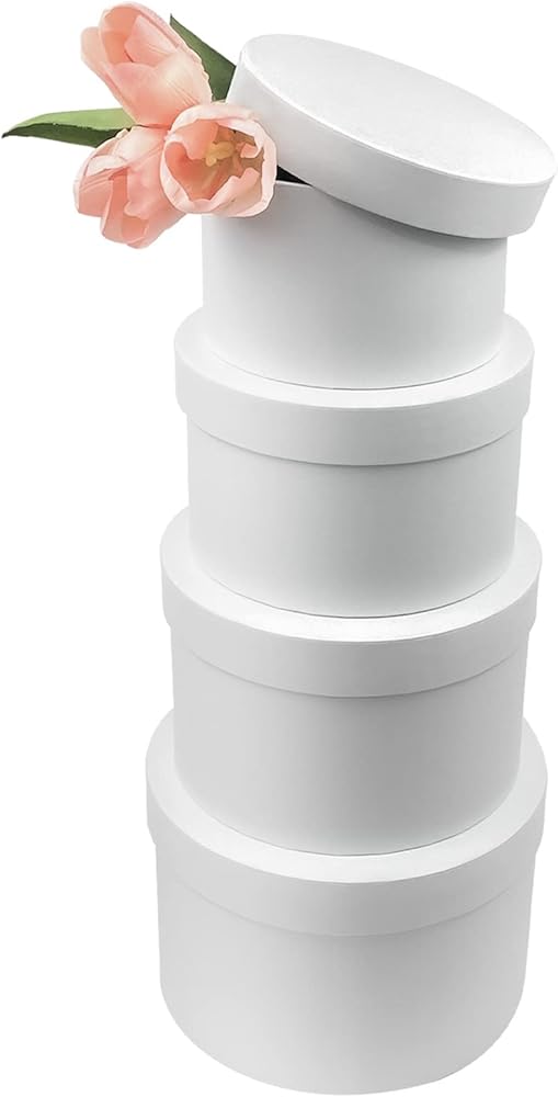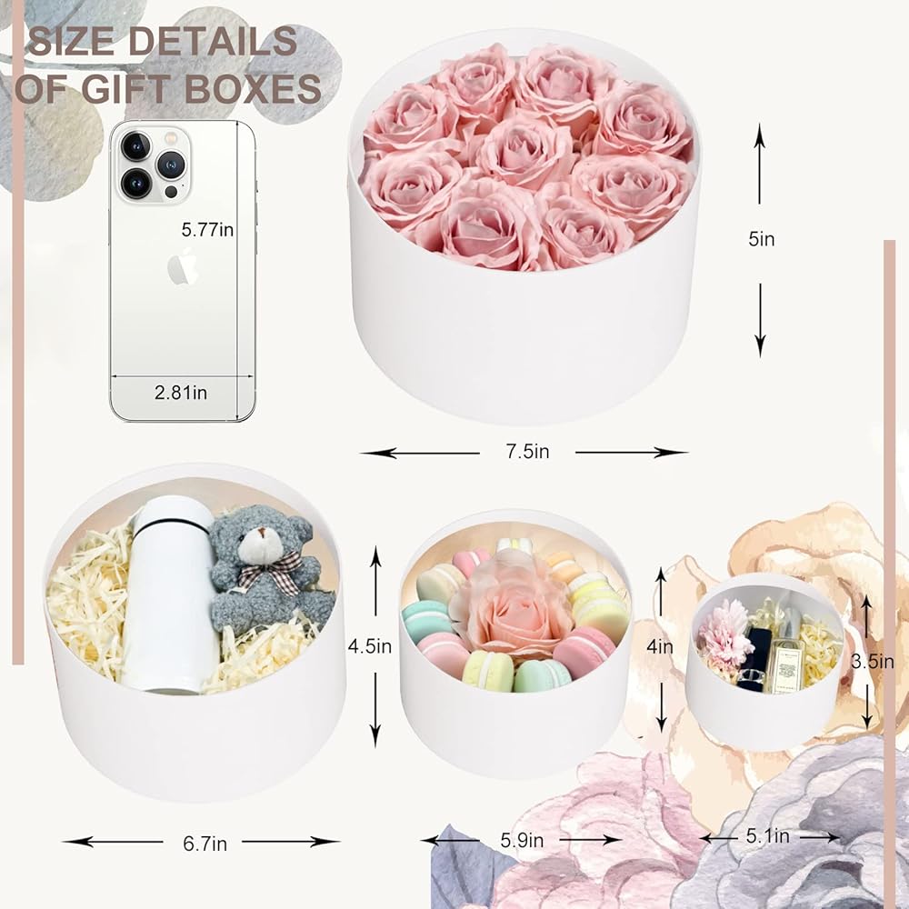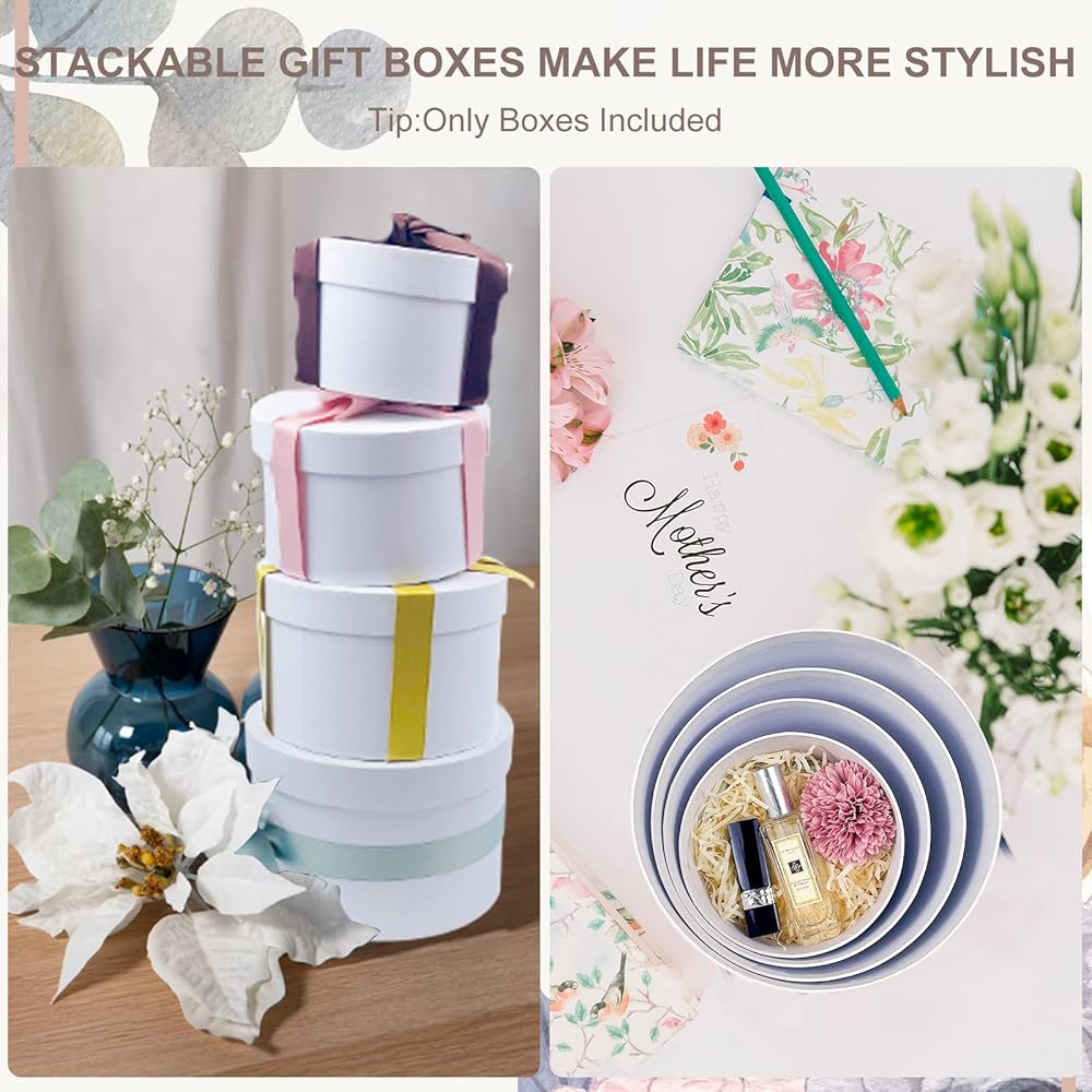 【صناديق زهور مستديرة فاخرة مطورة للترتيبات】تأتي صناديق الهدايا البيضاء ذات الأغطية في 4 مجموعات لتلبية احتياجاتك. مقاس صناديق الهدايا الصغيرة ذات الأغطية: 5.1 انش (عمق) × 3.5 انش (ارتفاع)؛ صندوق متداخل متوسط مع غطاء: 5.9 انش (عمق) × 4 انش (ارتفاع)؛ مقاس صندوق القبعة المستديرة البيضاء الكبير: 6.7 انش (عمق) × 11 انش .15 بوص(H(H(H)؛ صندوق هدايا كبير جدًا باللون الأبيض: 7.5 انش (عمق) × 5 انش (ارتفاع) (نصيحة: لا تتضمن ديكورات أخرى)