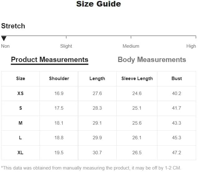 Size Chart: Small:Shoulder:17.9", Bust:41.7", Length:28.3", Sleeve Length:25.1", Bicep Length:16.1", Cuff:9"/ Medium:Shoulder:18.5", Bust:43.3", Length:29.1", Sleeve Length:25.6", Bicep Length:16.5", Cuff:9.4"/ Large:Shoulder:19.2", Bust:45.3", Length:29.9", Sleeve Length:26.1", Bicep Length:17.1", Cuff:9.9"/ X-Large:Shoulder:19.9", Bust:47.2", Length:30.7", Sleeve Length:26.5", Bicep Length:17.7", Cuff:10.4"/ XX-Large: Shoulder:20.6", Bust:49.2", Length:31.5", Sleeve Length:27", Bicep Length:18.3", Cuff:10.9"/