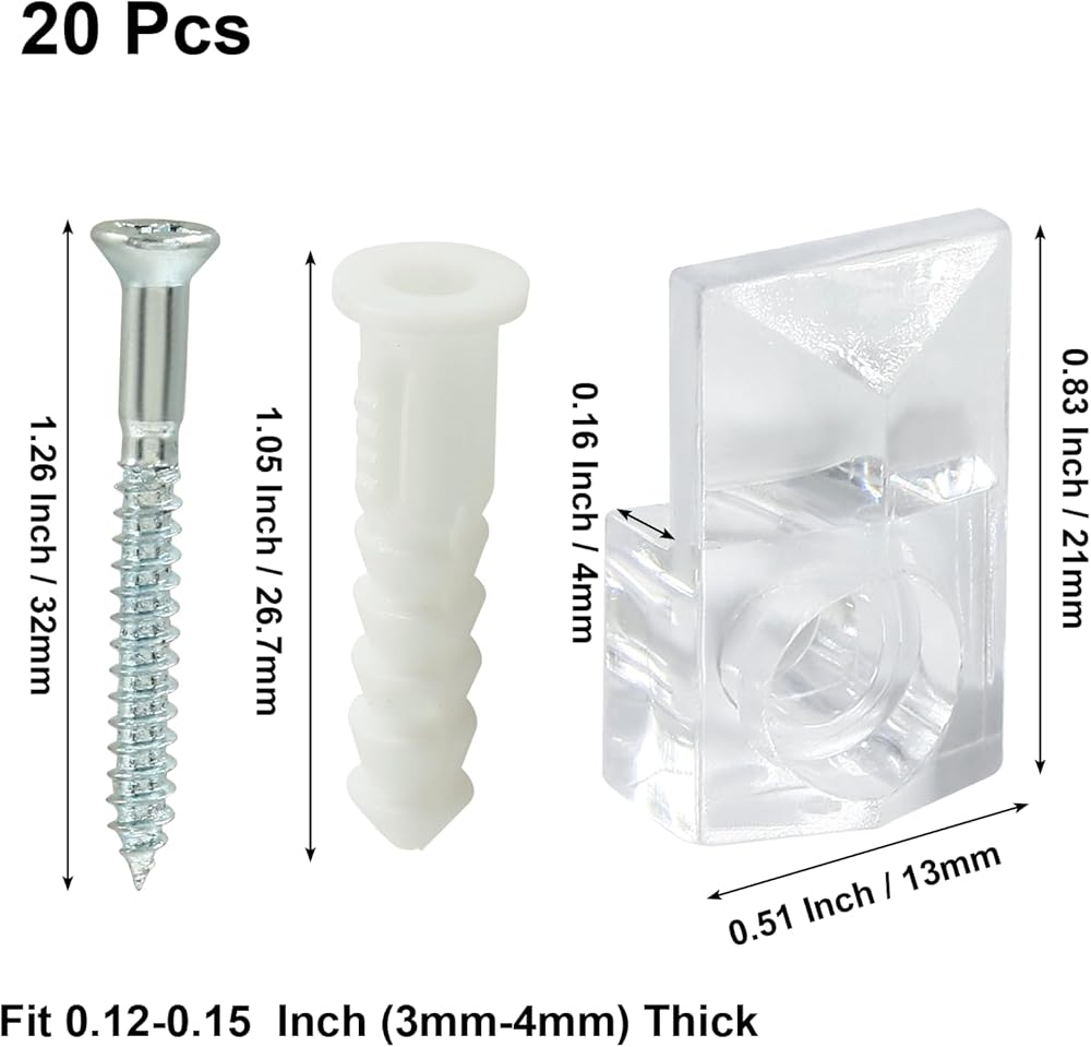 • Package Includes: 20 x Mirror Mounting Clips ( 0.83 x 0.51 Inches / 21mm x 13mm ), 20 x Mounting Screws, 20 x Hollow Wall Anchors