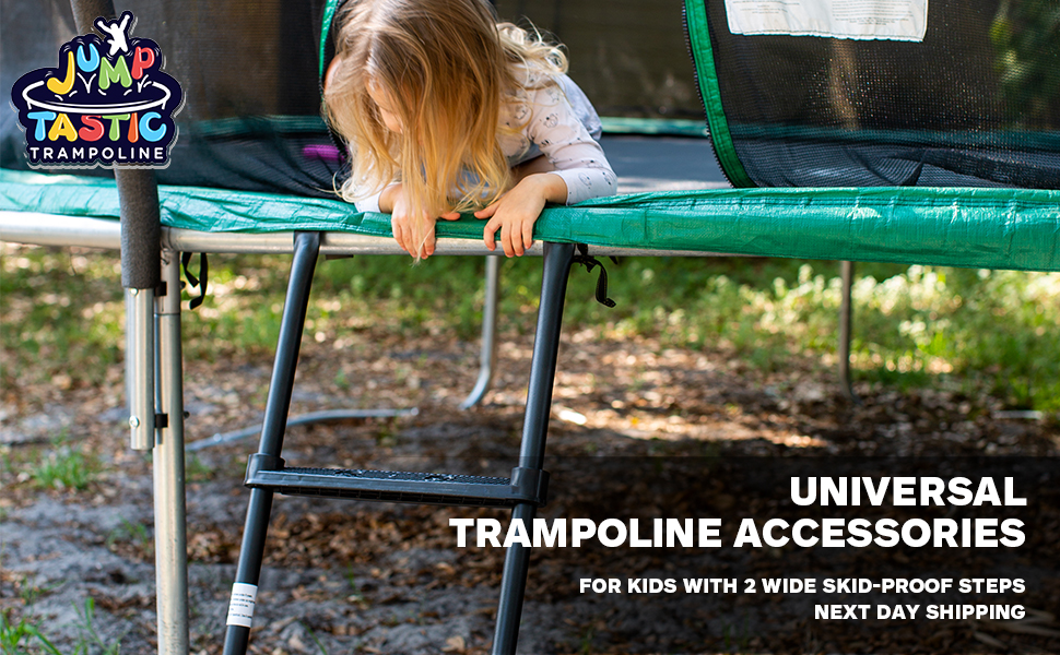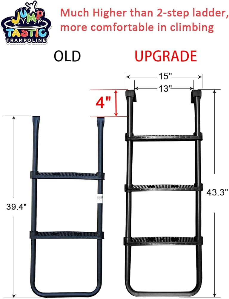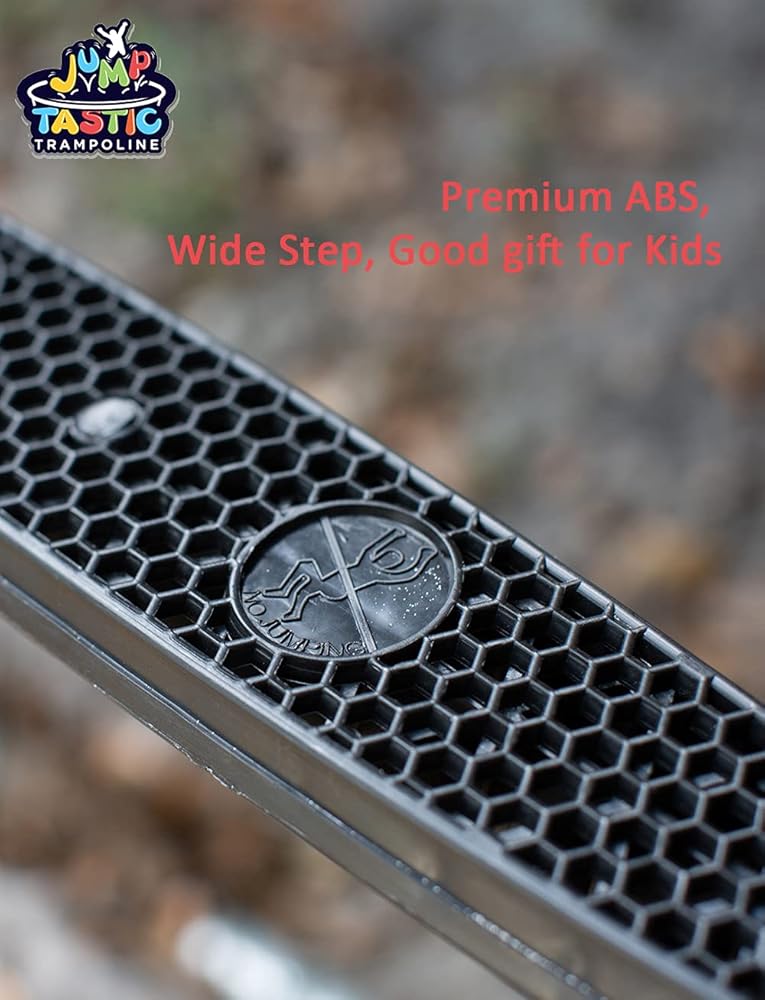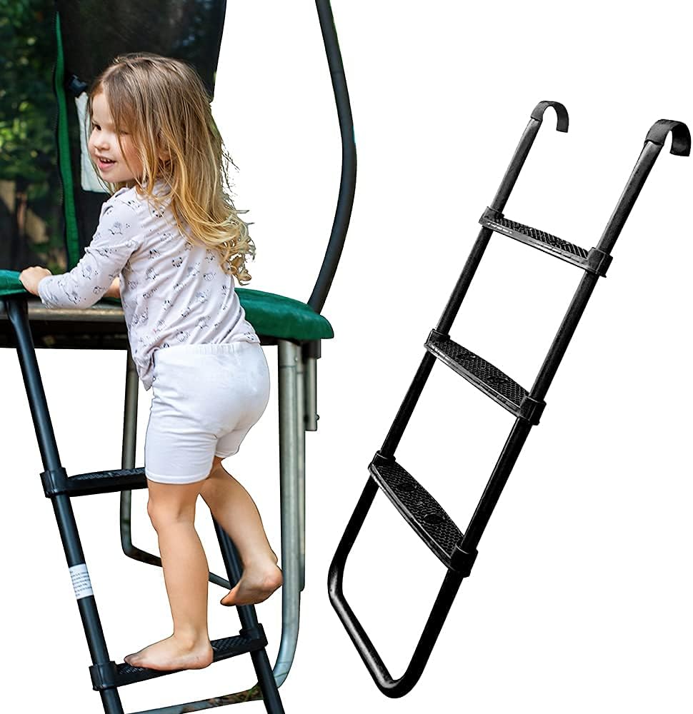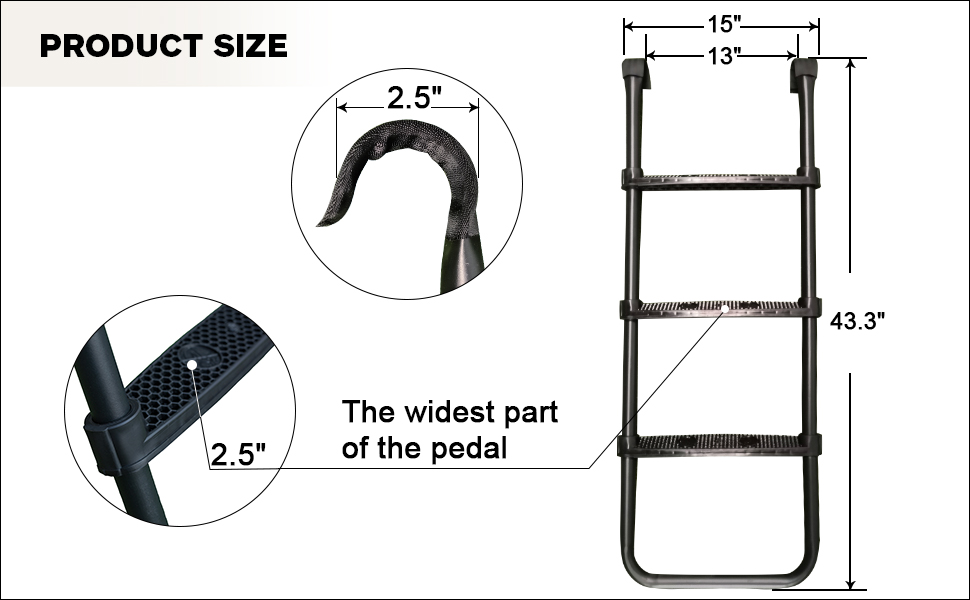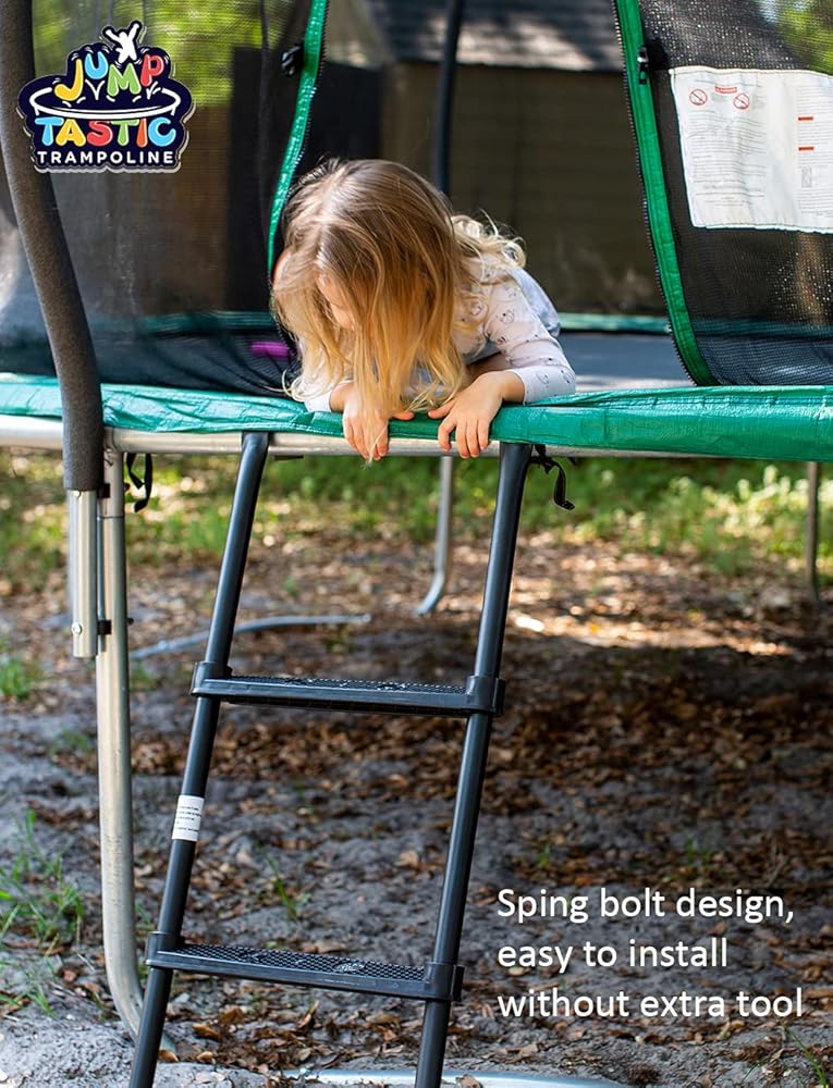 تصميم شامل: الارتفاع الكلي للسلم 43.3 انش، يناسب الترامبولين 10 قدم، 12 قدم، 14 قدم، 15 قدم وجميع أحجام الترامبولين، الارتفاع بين الخطوة 10.5 انش، إنه سهل وآمن للأطفال للصعود والنزول من الترامبولين دون مساعدة