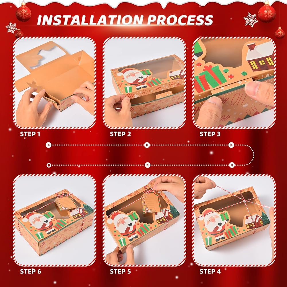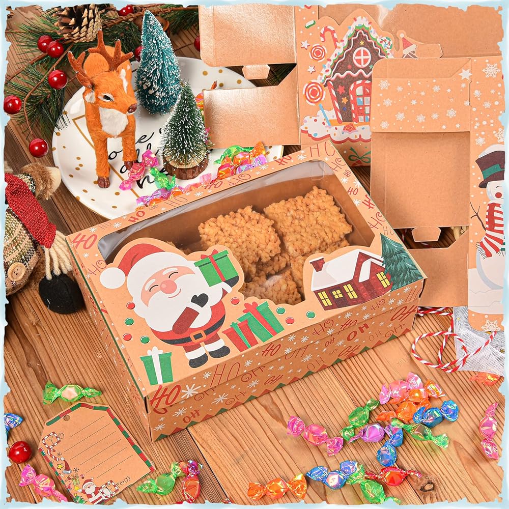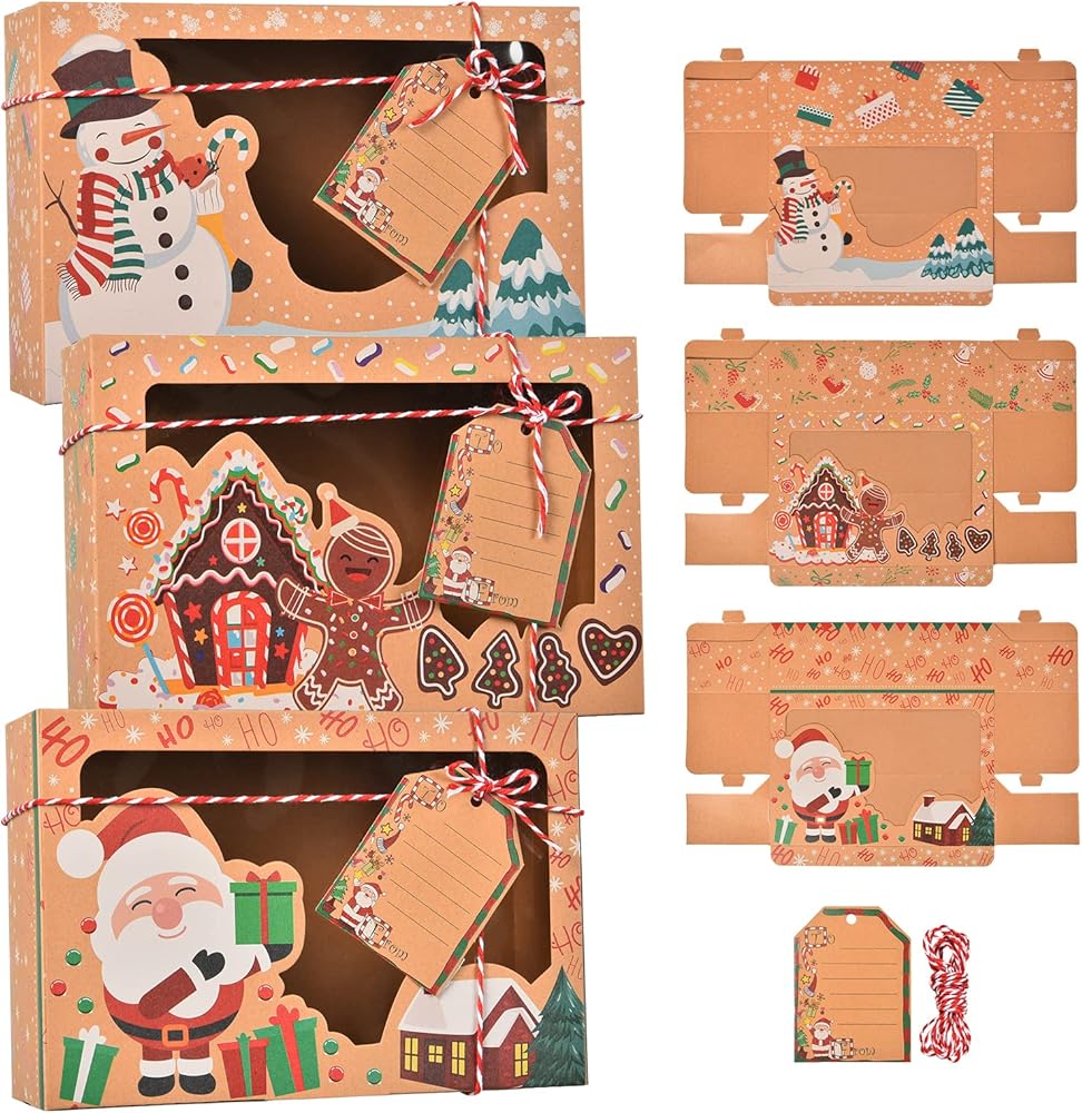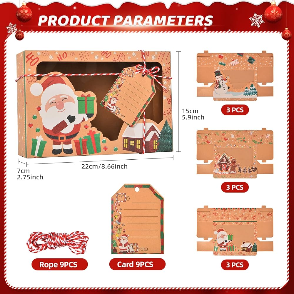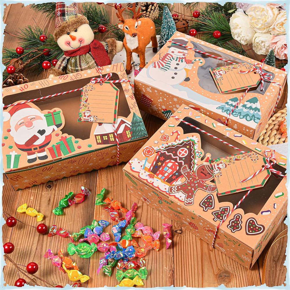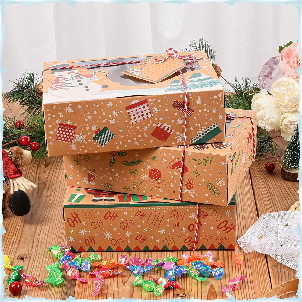 qonmpcvu 9 عبوات كبيرة من علب هدايا عيد الميلاد أو الحلوى، وصناديق حلوى مخبوزات الطعام لتقديم الهدايا، وحاويات تغليف المعجنات، ومفضلات الحفلات، وصناديق هدايا كرافت مع أشرطة وبطاقات هدايا ذاتية الصنع