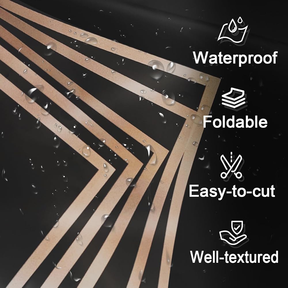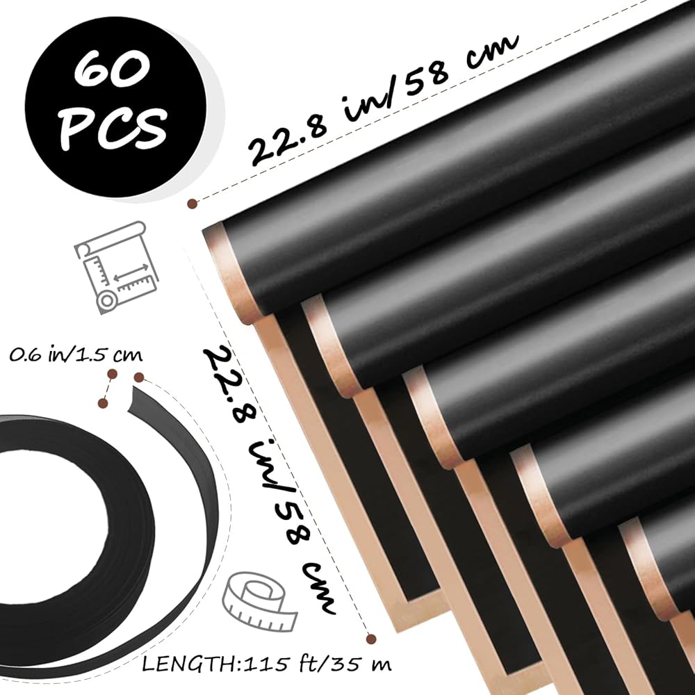 Package Included:Our products include 60 sheets of black wrapping paper (each size 22.8*22.8inch/58*58cm) and 1 roll of 115ft(35m) of ribbon (each roll width 0.6inch/1.5cm),the quantity of these materials is sufficient to provide you with the freedom of packaging creation.