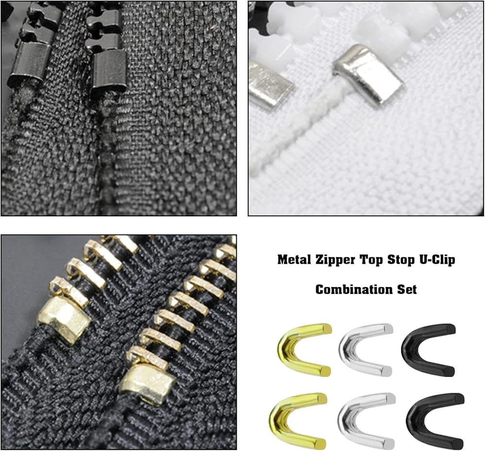 -Includes 2 sizes of accessories, size #5 #8 zipper accessories, there are three colors, gold, black, silver, each 10pcs, a total of 60pcs top stop U-clip, to meet all your different maintenance needs.