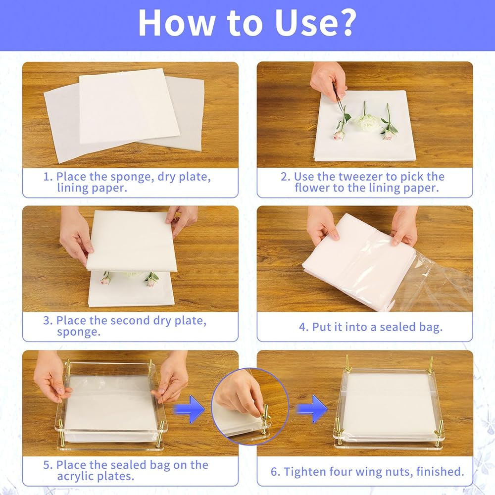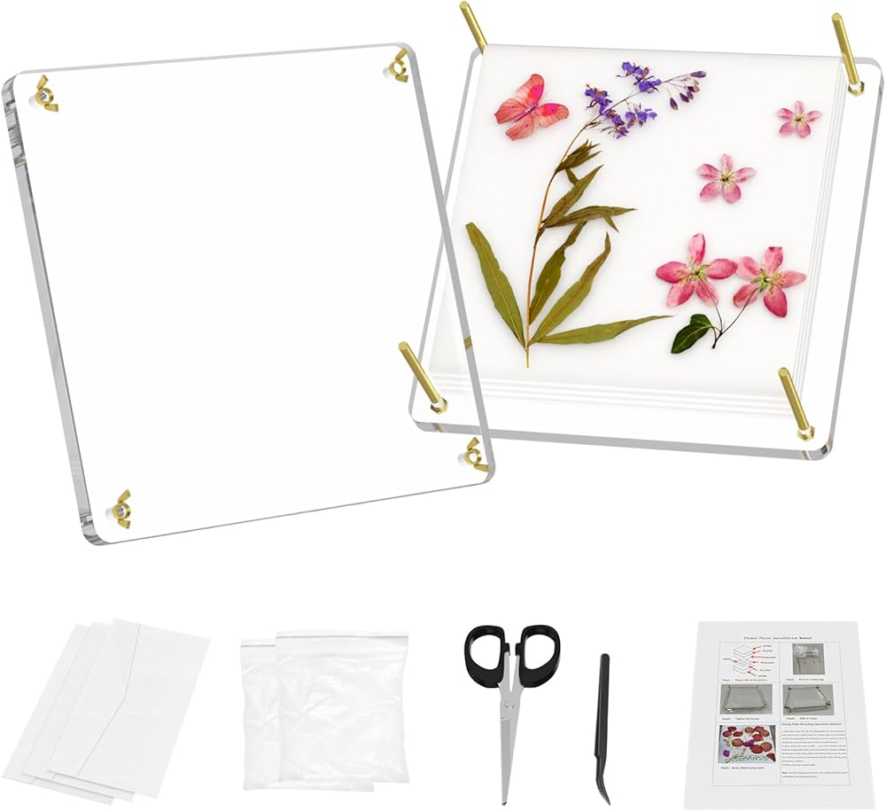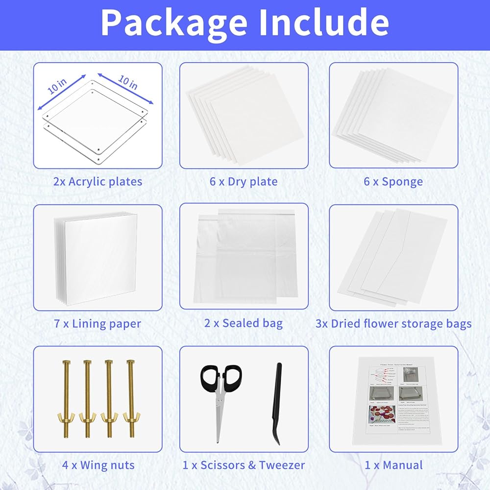 ❀مجموعة ضغط الزهور الكاملة: تحتوي مجموعة ضغط الزهور على الأدوات التي تحتاجها لعصر الزهور، بما في ذلك 2 × طبق أكريليك، 7 × ورق بطانة، 6 × أطباق جافة، 6 × إسفنجات، 4 × صواميل وإسفنجة، 1 × مقص، 1 × ملقط، 2 × أكياس تخزين الزهور المجففة، 2 × حقيبة محكمة الغلق، 1 × دليل الاستخدام. ولكن لا يشمل الزهور أو الأوراق. تتضمن مجموعة عصر الزهور الخاصة بنا كل ما تحتاجه للبدء على الفور.