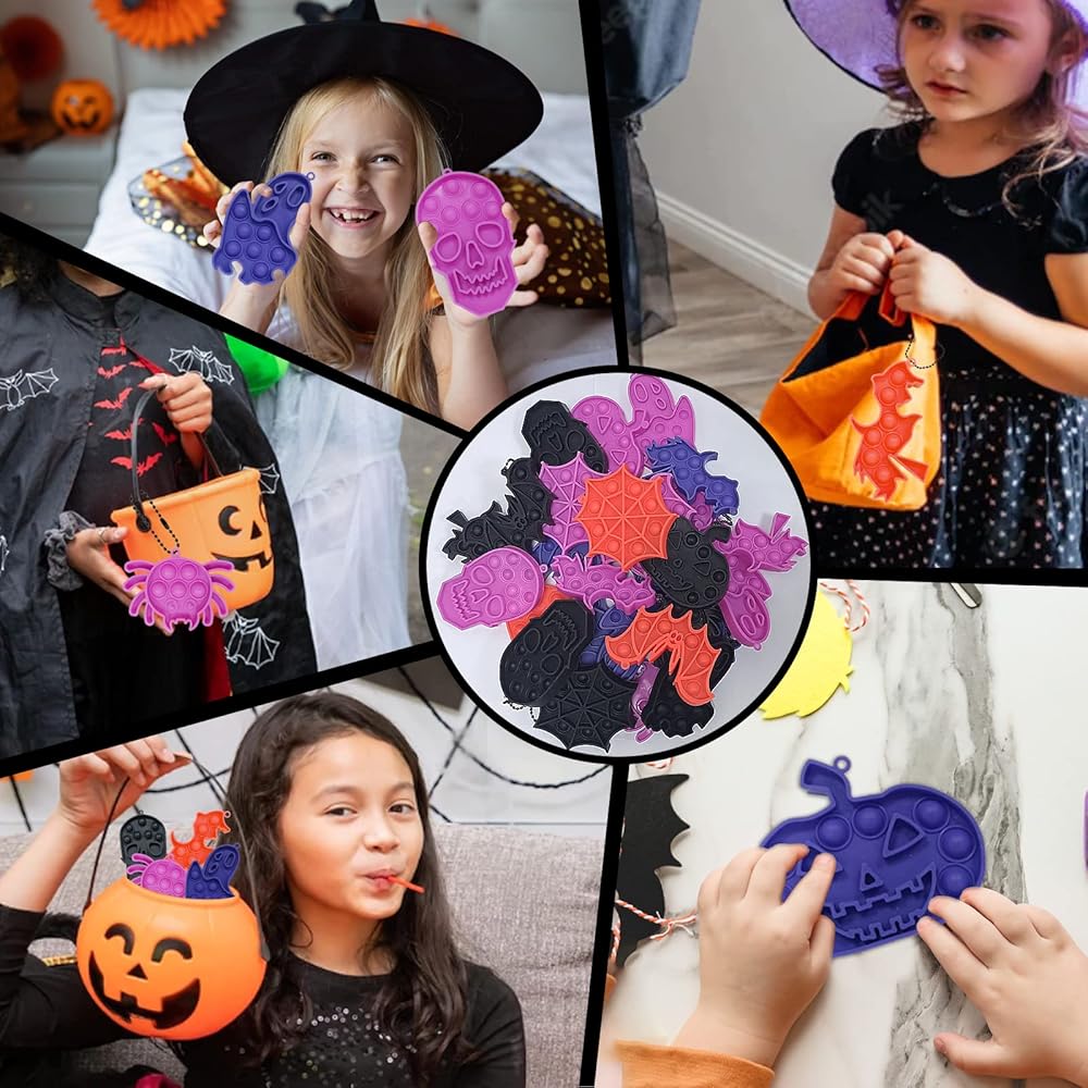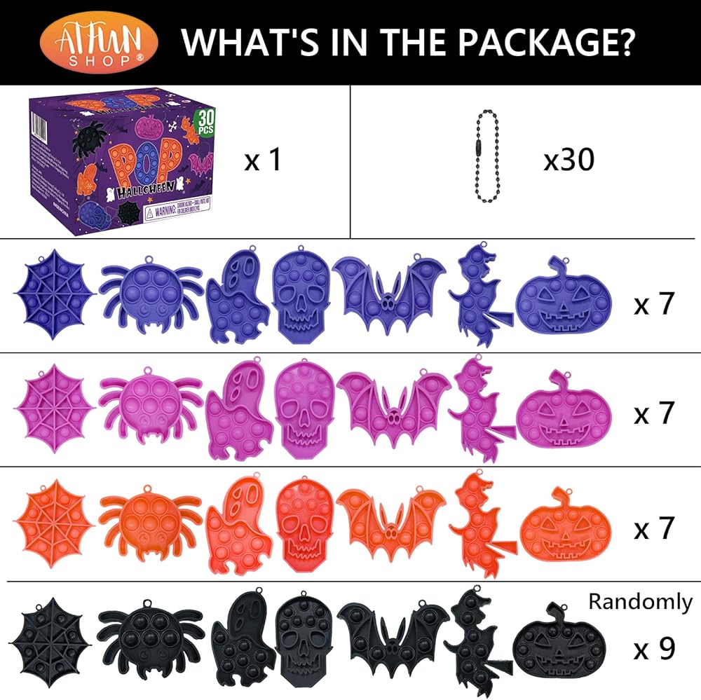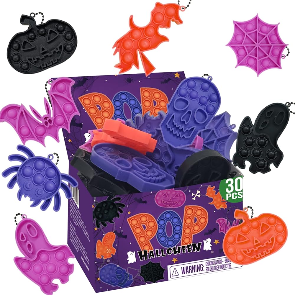 30 حزمة من ألعاب الهالوين الحسية الململة مع سلسلة مفاتيح هدايا حفلات الهالوين للأطفال الأولاد والبنات ألعاب فقاعات الدفع للهالوين بكميات كبيرة من السيليكون لتخفيف التوتر