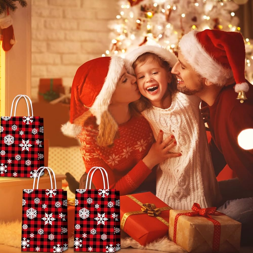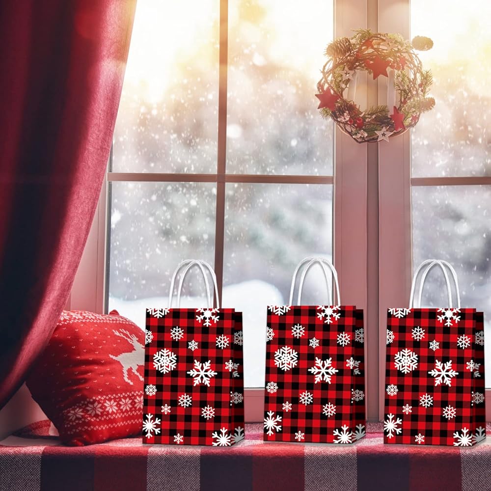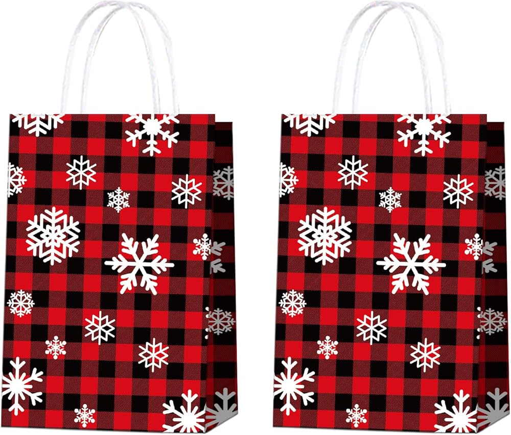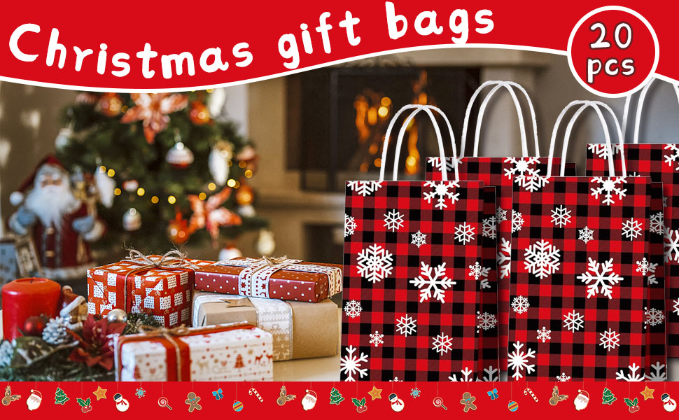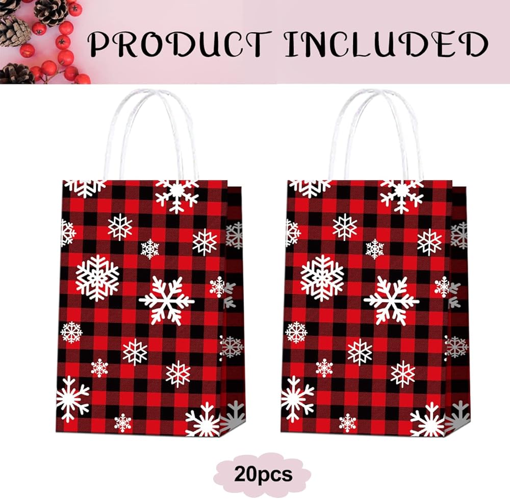 ★تشمل العبوة: 20 قطعة من أكياس هدايا عيد الميلاد، أكياس هدايا منقوشة على شكل ثلج من الجاموس باللونين الأحمر والأسود، مع مقابض من الحبال الورقية البيضاء.