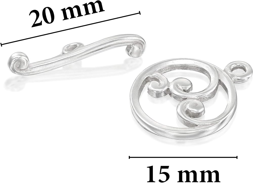 مشبك تبديل فاخر من الفضة الإسترلينية عيار 925 عالي الجودة. يحتوي كل مشبك على جزئين؛ يبلغ مقاس العنصر المستدير مع حلقة واحدة 15 مم أو أقل بقليل من 5/8 بوصة في الحجم وشريط واحد مع حلقة قياس 20 مم أو ¾ بوصة في الطول