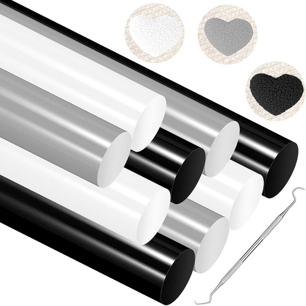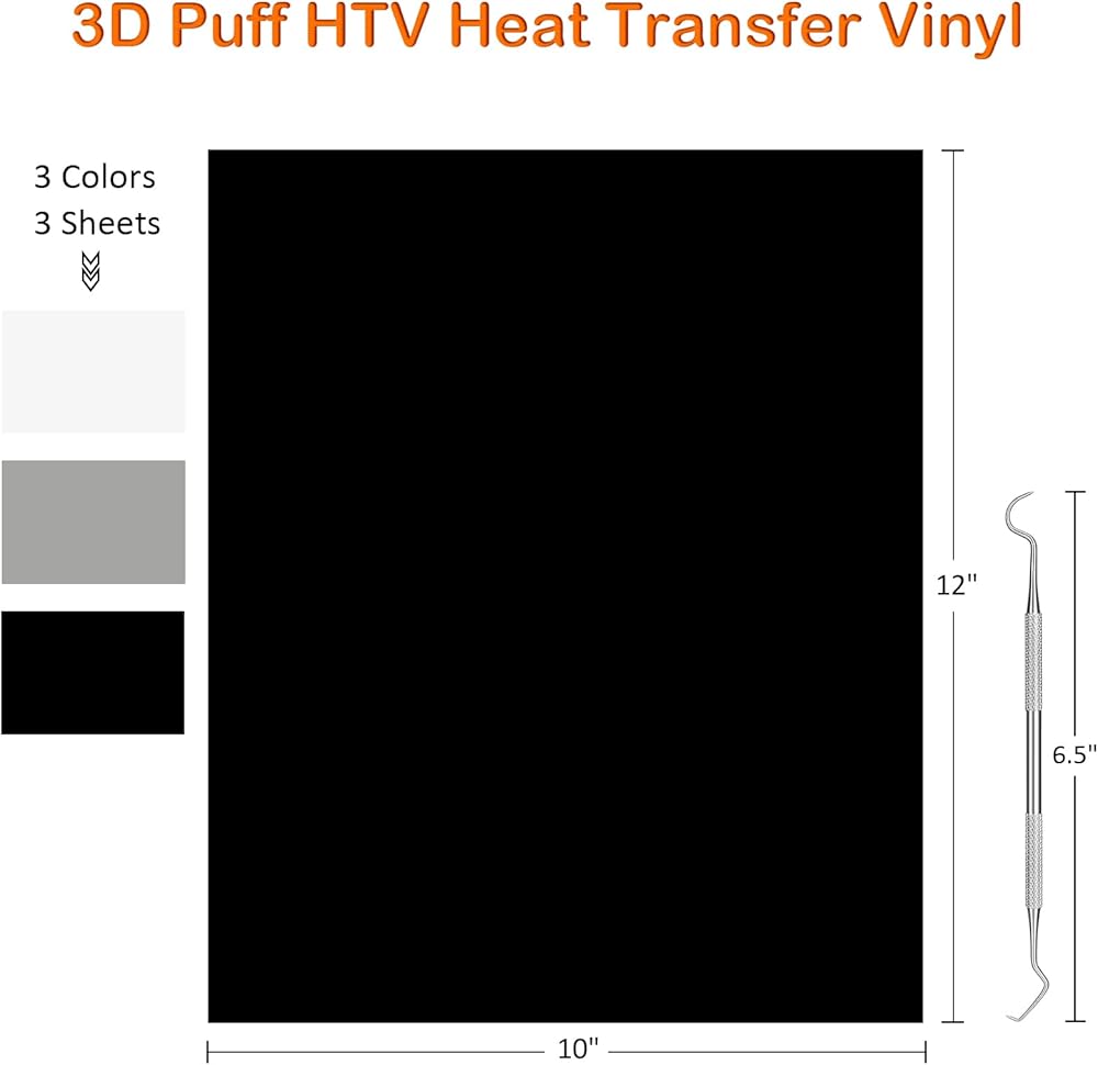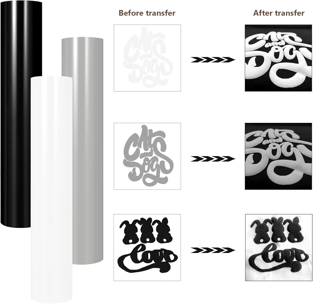 Perfect Puff Vinyl Roll Set: Get a total of 9 rolls of HTV vinyl, 3 rolls each of white, black and grey, measuring 10" x 12" with a dual-head weed tool.Our foaming Vinyl with good craft can provide a perfect kisscut, compatibility with most popular cutting machines & heat presses. Apply at 305°F for 15 seconds, then then easily peel off the protective film under the weeding tool.