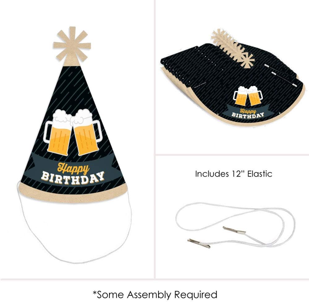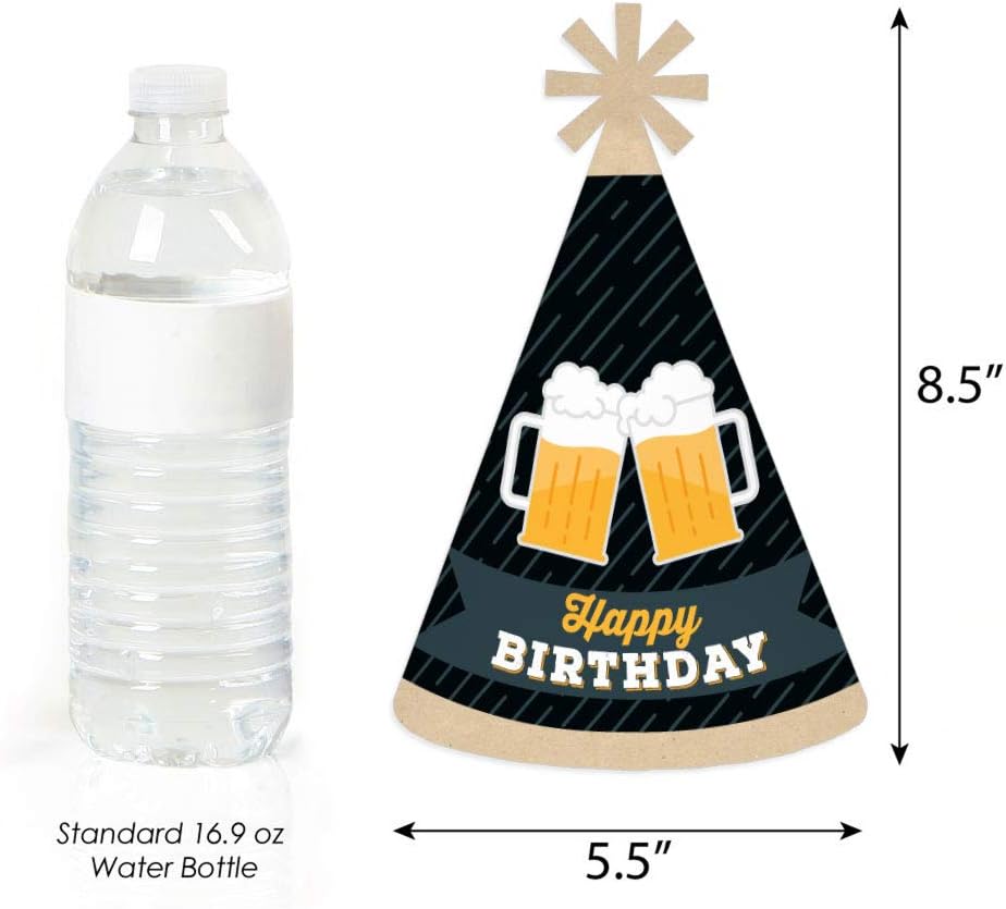 قبعات عيد ميلاد سعيد بعبارة Cheers and Beers بطول 8.5 انش وقطر 5.5 انش في القاعدة. يبلغ طول أحزمة الذقن المرنة المتضمنة 12 انش. تتميز كل قبعة من قبعات الحفلات الممتعة هذه بزخرفة فريدة من نوعها على شكل نجمة في الأعلى ومطبوع عليها "Happy Birthday" على الجهة الأمامية.