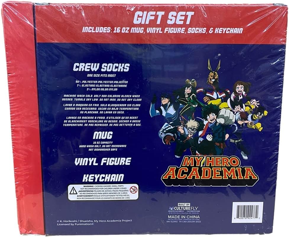 مرخصة رسميًا ومثالية لمحبي ماي هيرو اكاديميا، مجموعة هدايا هذا الكوب والجوارب وسلسلة المفاتيح هدية رائعة! املأه بالمشروب الساخن الذي تختاره واستمتع بأنك ستحب كل شيء في هذا الكوب، التصميم، كيف يتم تعبئته، إنه رائع ومن محبي ديكو. جوارب ماي هيرو اكاديميا للجنسين يُغسل في الغسالة بماء دافئ مع الألوان المشابهة. هذا المنتج عالي الجودة مصنوع من خليط معدني من الزنك الصديق للبيئة، ولا يحتوي على مواد ضارة.