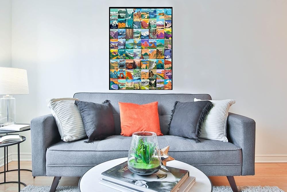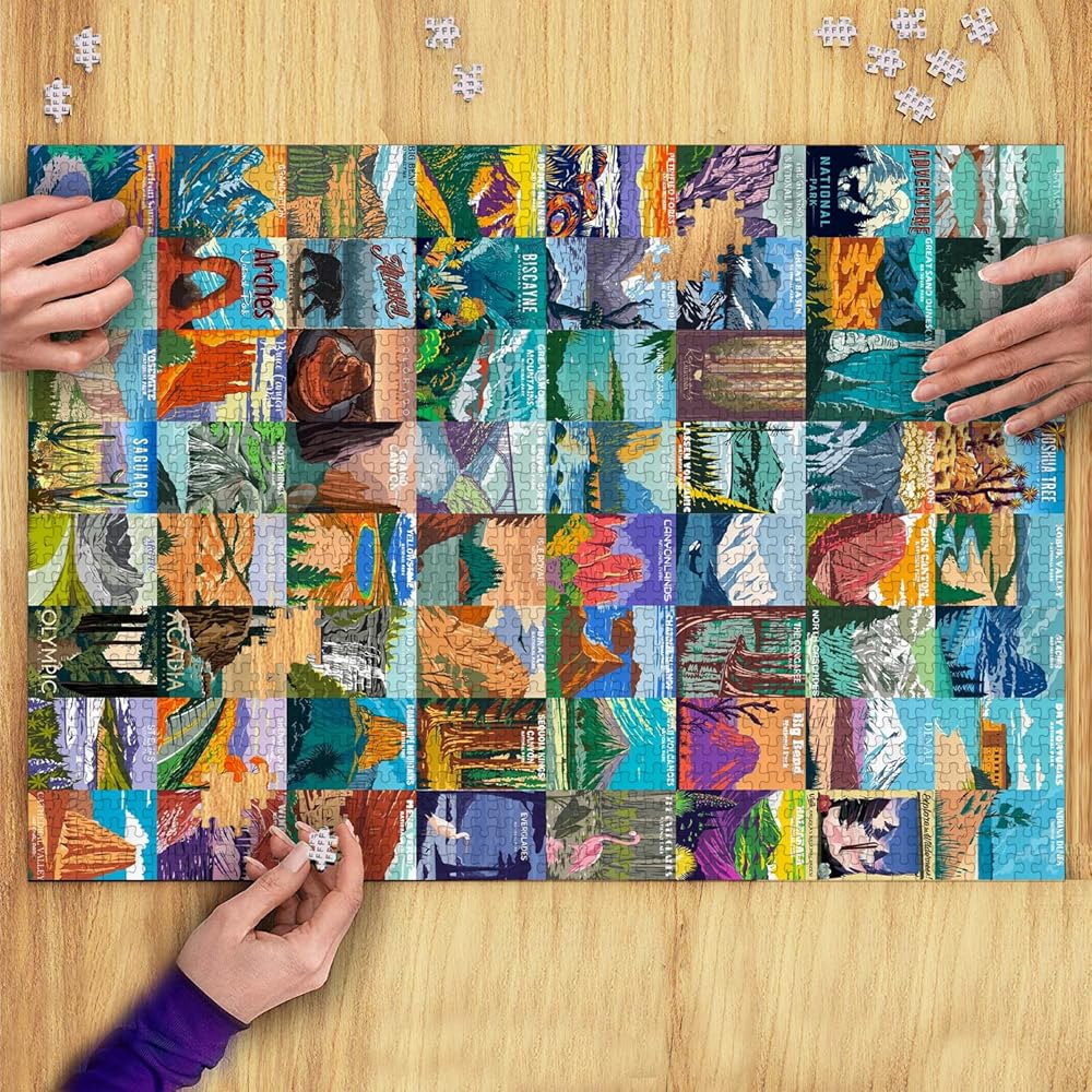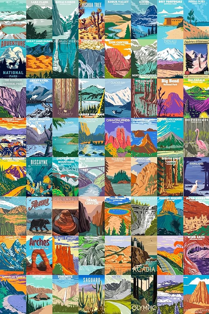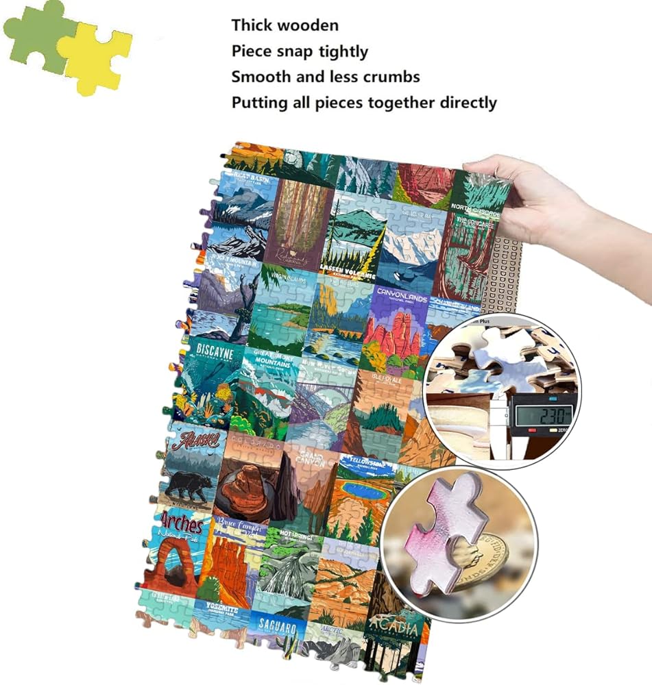 أحجية المتنزهات الوطنية الخشبية للبالغين 1000 قطعة - جميع ملصقات ألغاز المتنزهات الوطنية البالغ عددها 64 تتضمن يلوستون، يوسمايت، كولورادو/جراند كانيون، نهر جليدي/صهيون/عتيق/أكاديا، يتضمن ملصق كبير