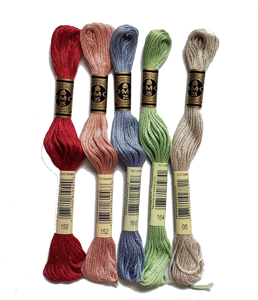 قطن مطرز بستة جدائل من دي ام سي. خيط رائع مكون من ستة جدائل مصنوع من ألياف قطنية طويلة التيلة ومزدوجة التيلة بنسبة 100%. تتضمن الحزمة: وردي داستي داكن للغاية - 117-150 ، وردي فاتح متوسط - 117-152 ، أزرق رمادي متوسط - 117-160 ، أخضر فورست فاتح - 117-164 ، خشب دريفت فاتح متوسط - 117-06