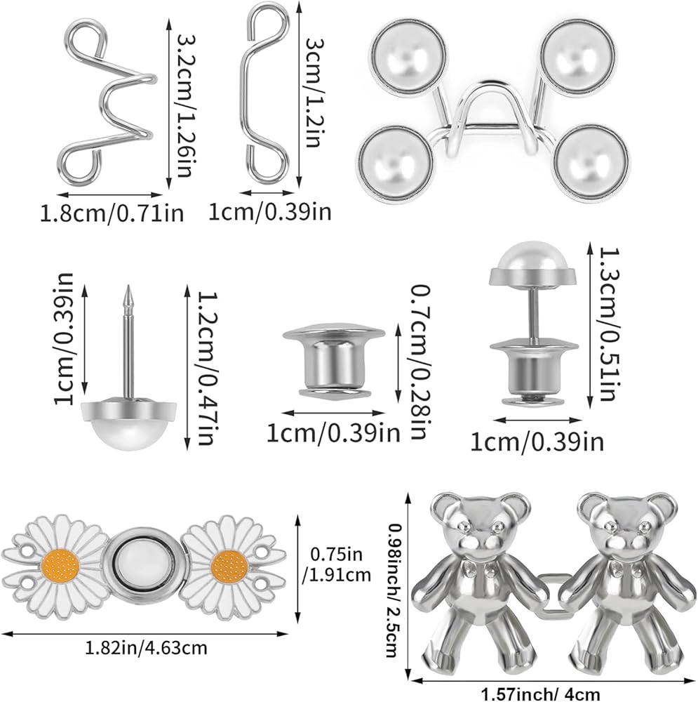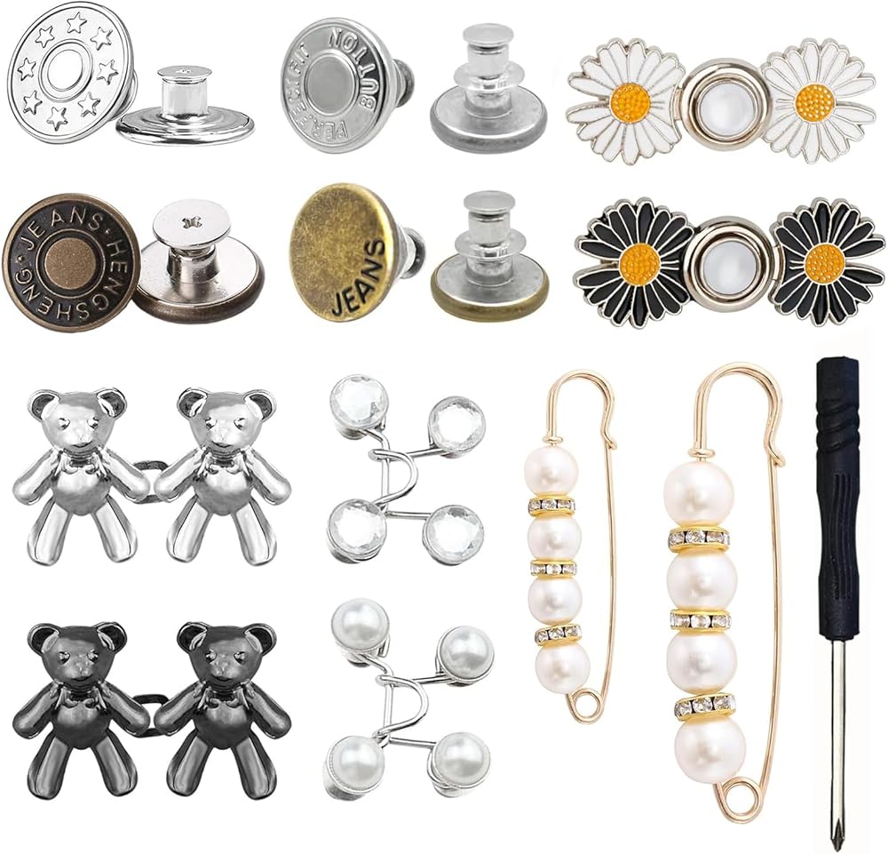 • 【Variety of Jeans Pins for Your Pants】-You will get 12 set jeans buttons, 2 sets no tools instant replacement snap, 2 sets no sew nailess removable metal jeans buttons, 2 sets pearl and diamond adjustable buckle extender Set, 2 sets small daisy flower button, 2 sets pearl brooch sweater shawl clip, 2 sets cute bear jeans waist buckle. A variety of styles to decorate your pants.