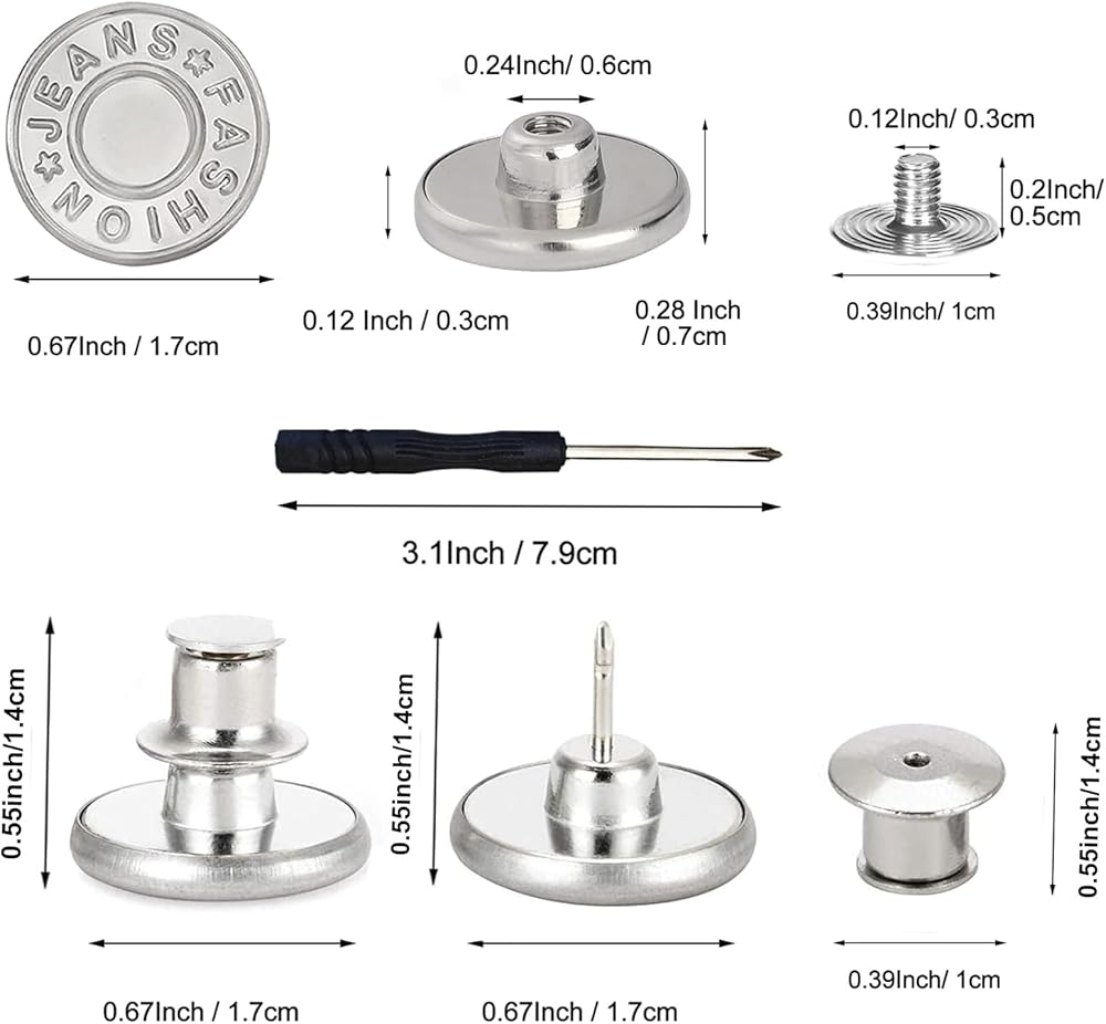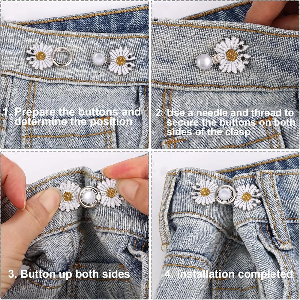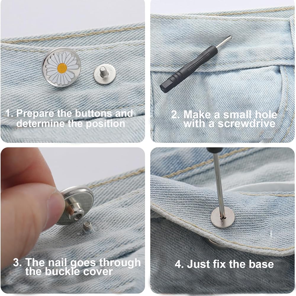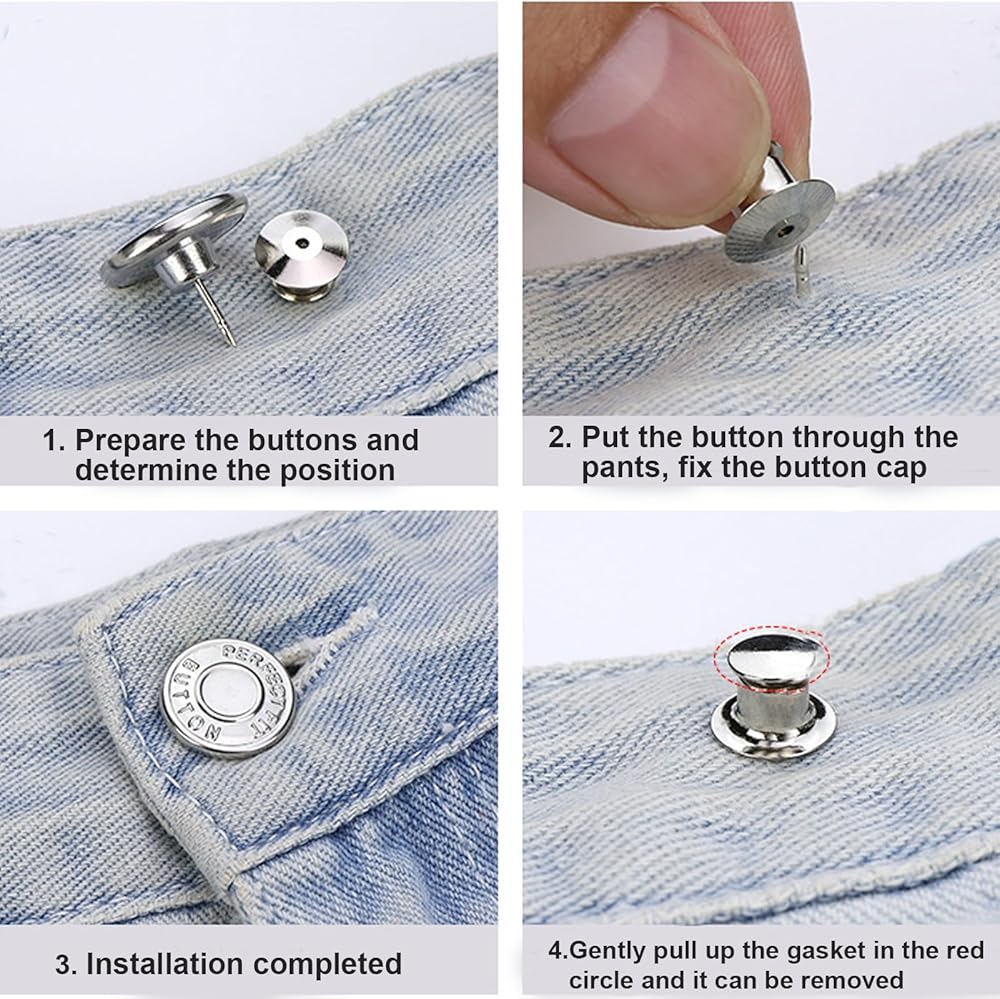 Made from high-quality metal, these adjustable, no sew detachable buttons are designed to help you achieve the perfect fit without any hassle.With our Jeans Button Pins, you can easily tighten the waist of your pants without the need for any sewing skills. Simply attach the button pin to the waistband of your jeans or pants, and adjust it to the desired fit. It's quick, easy, and convenient!