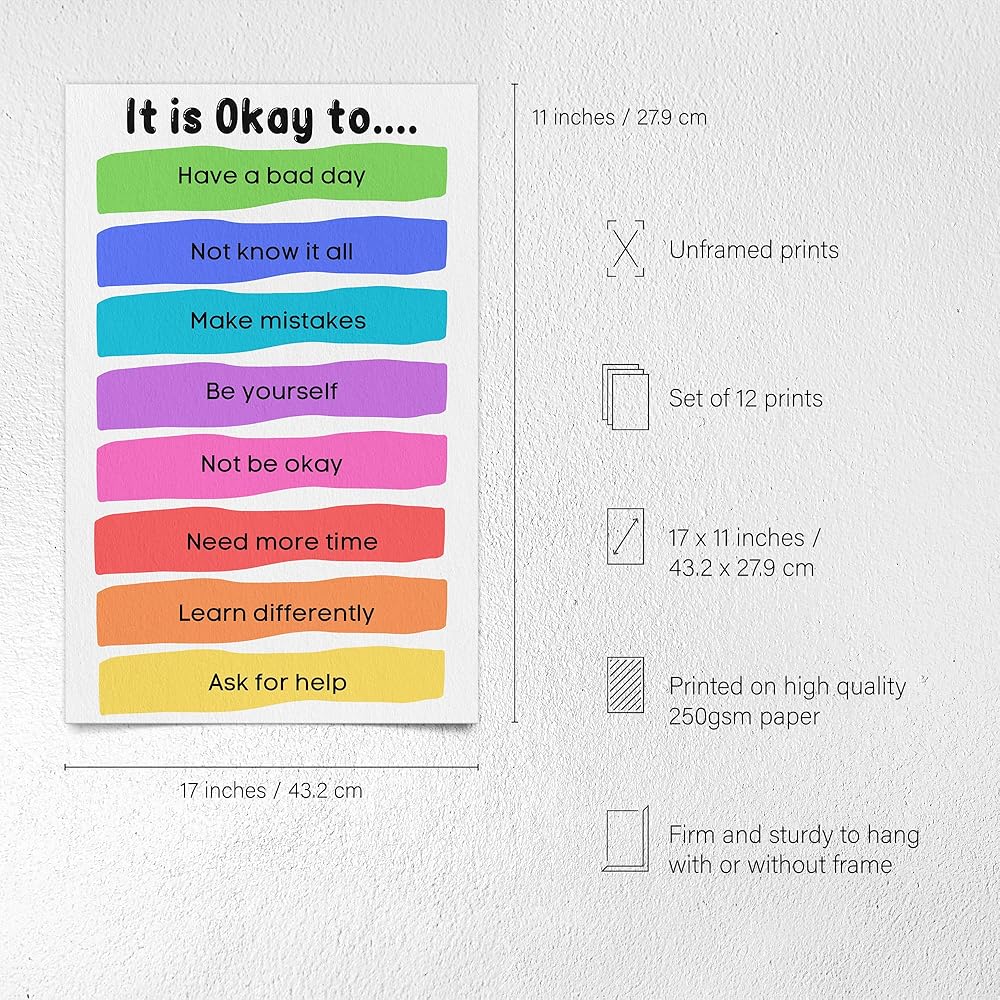 مقاس 11 × 17 انش - مطبوع على ورق ثقيل الوزن 250 غرام لكل متر مربع، تم تصميم كل ملصق ليكون مؤطرًا في إطار صورة مقاس 11 × 17 انش - أو يمكن لصقه على الحائط بدون إطار. يمكن دمج المجموعة المكونة من 12 قطعة بسهولة في عرض ديكور رائع للفصل الدراسي في الزاوية الهادئة.